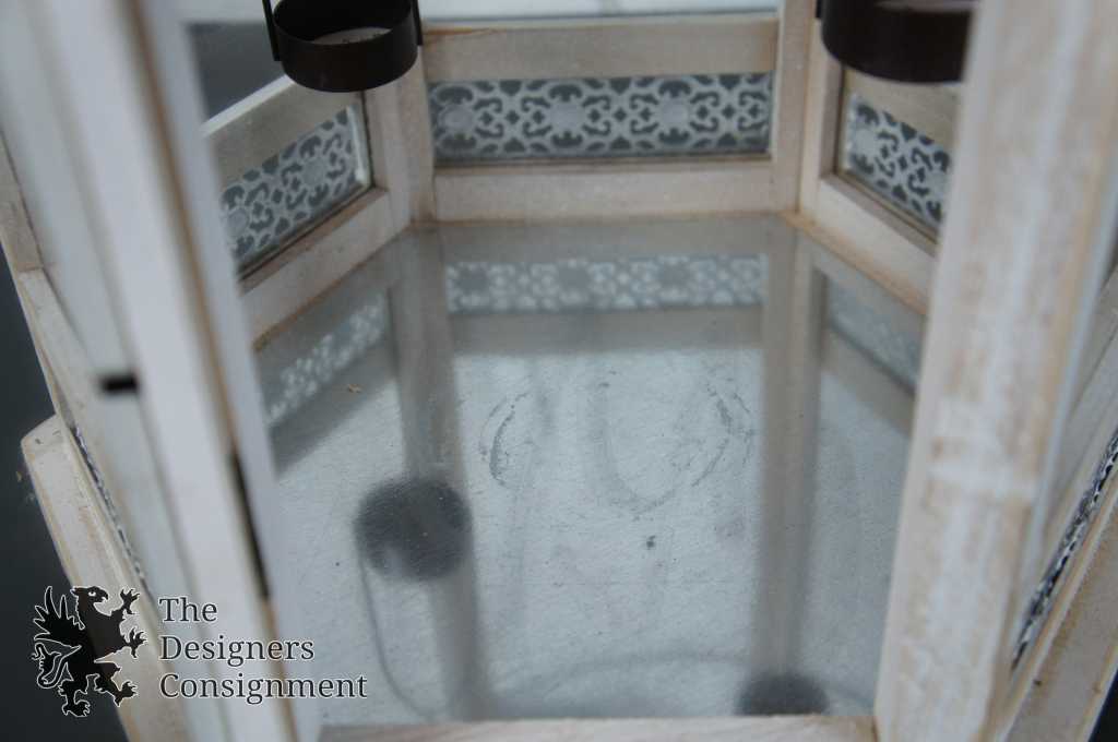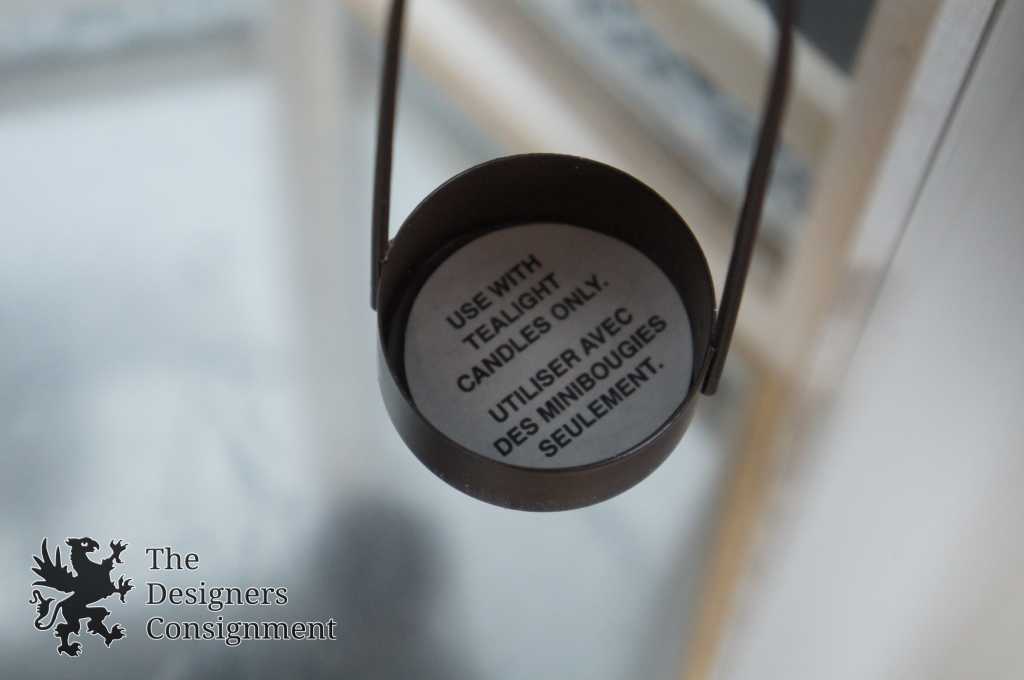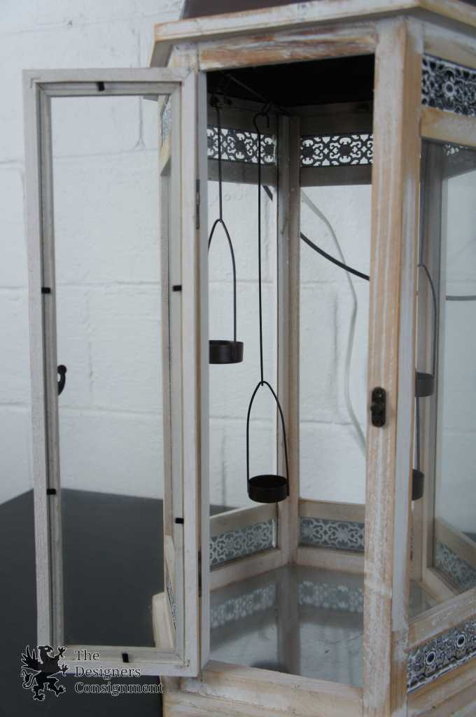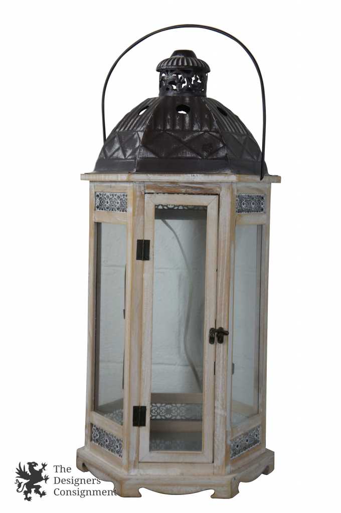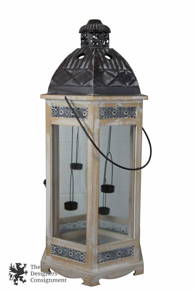 Monumental Moroccan Votive Lantern. Made from whitewashed wood with a pierced metal dome and lattice inserts. Interior features 4 staggered hanging positions for tea lights. A neat compliment to any setting.