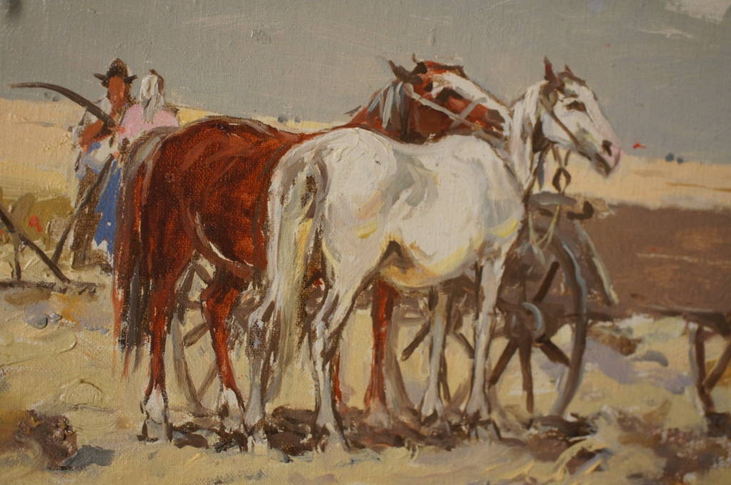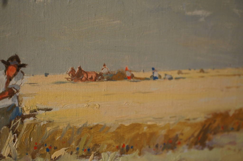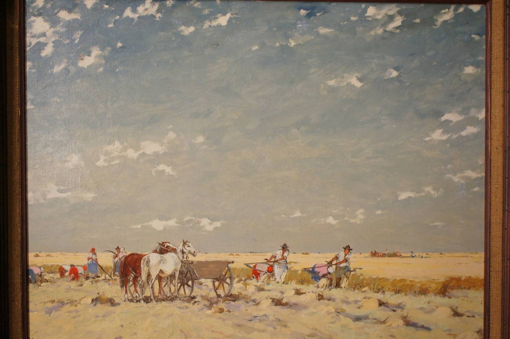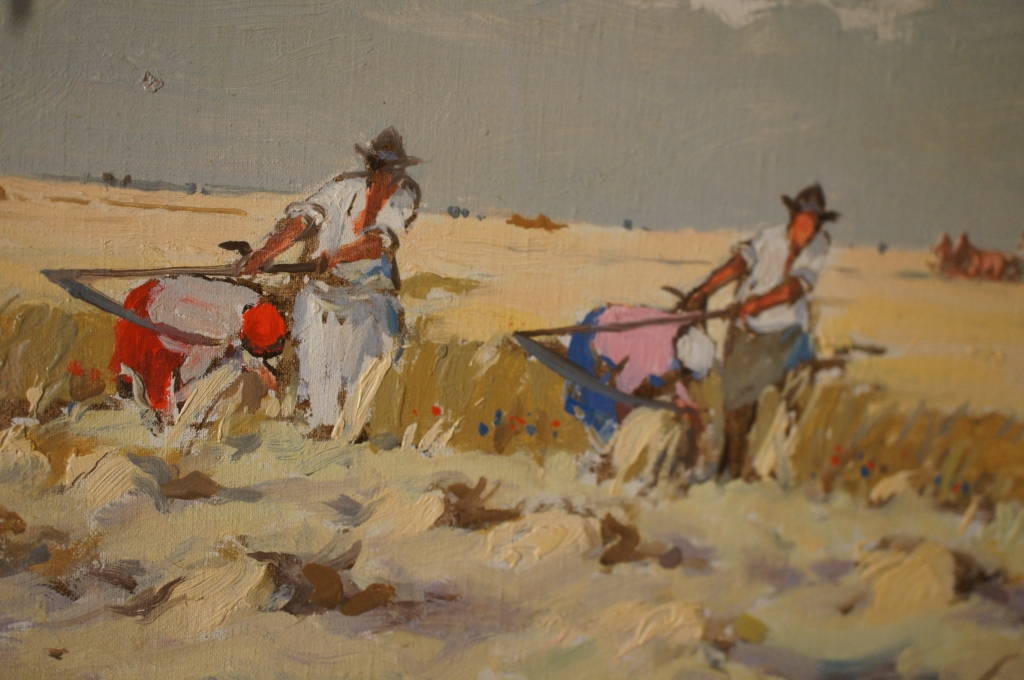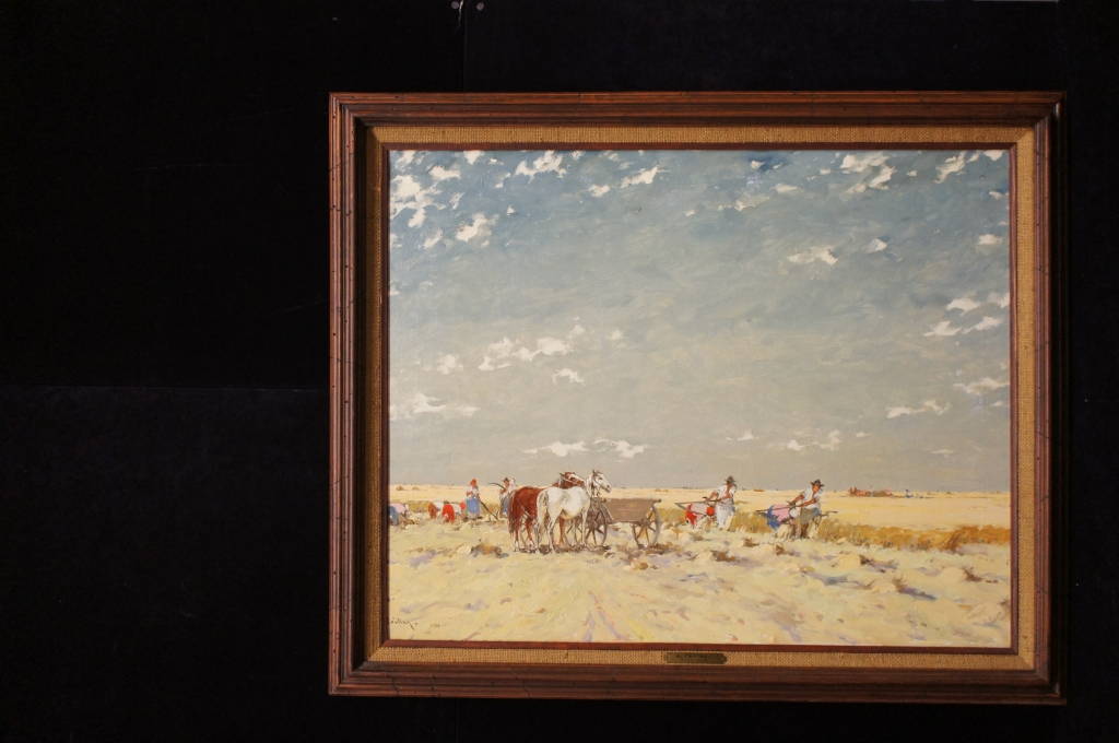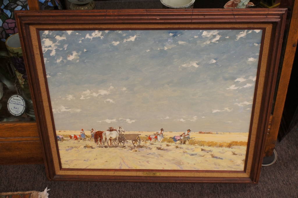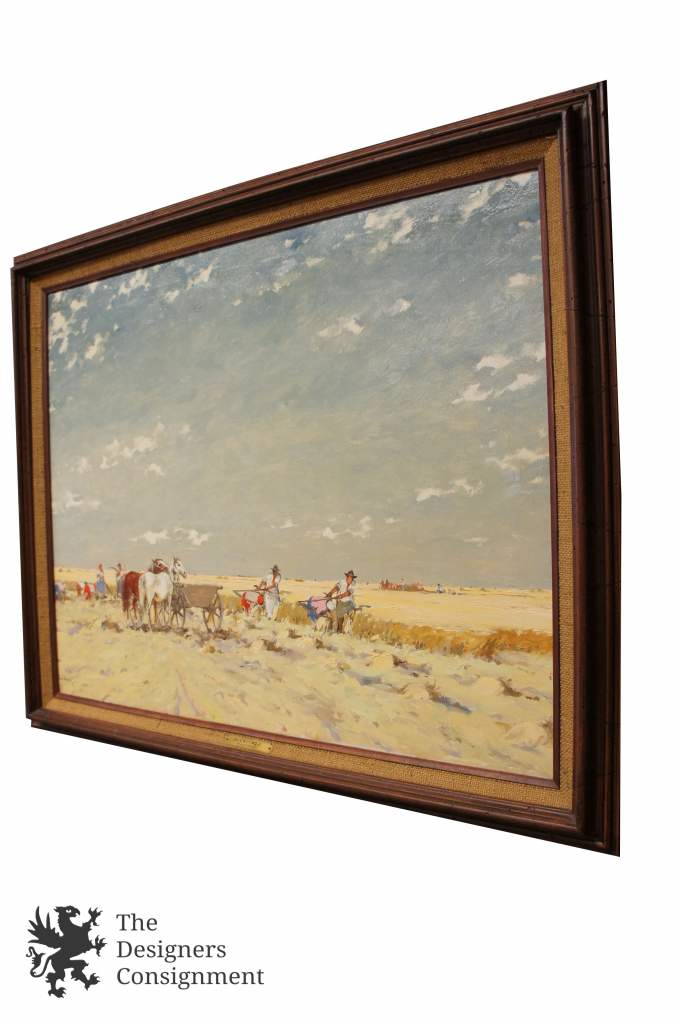 A beautiful original oil by Yozsef Csillag (1894 - 1977) a Hungarian artist known for his landscapes. This piece is titled Harvest, and features workers in the field on a cloudy day. The attention to detail is absolutely stunning. Framed in a distressed Mahogany with a name plate and title on the matte. A fine addition to any collection!