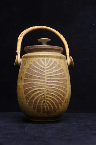 Vintage Earthenware Lidded Jar Wicker Handle Signed 1975 Clay Ceramic Crock 9