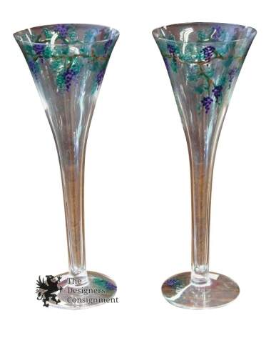 2 Vintage Grape Vine Painted Stemware Champagne Flutes Glassware Toast Vase
