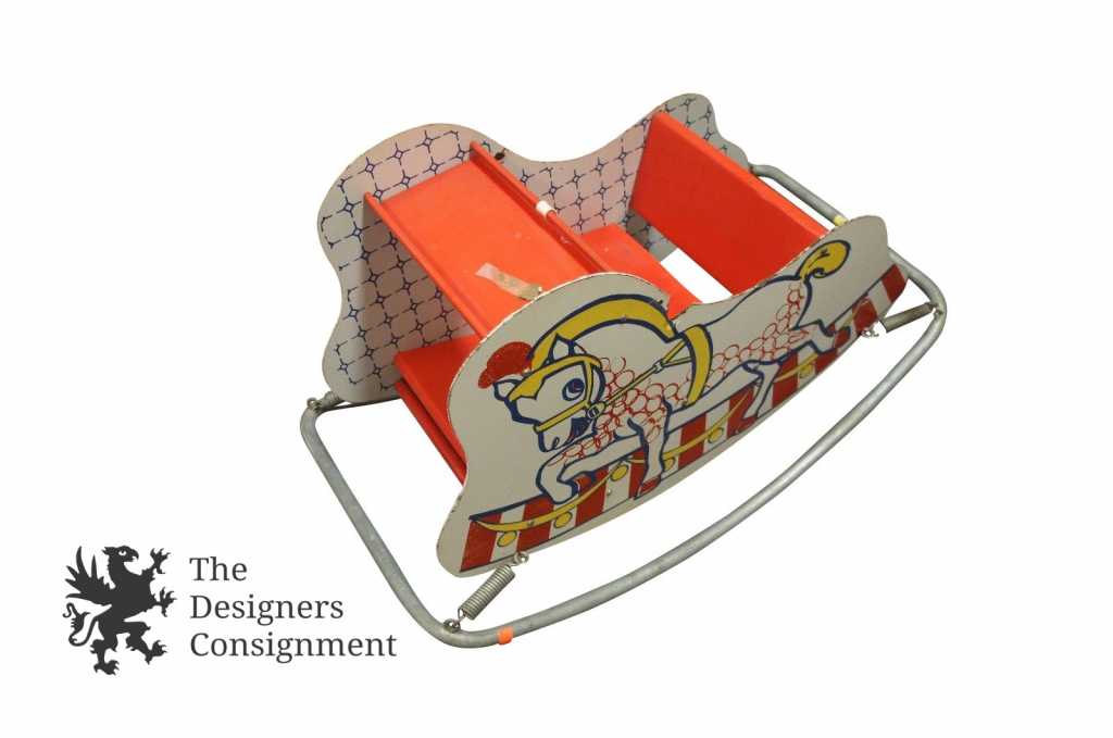 A lovely vintage rocking horse. Perfect for a toddler or young child. Bounces and rocks. Each side features the same pony lithograph