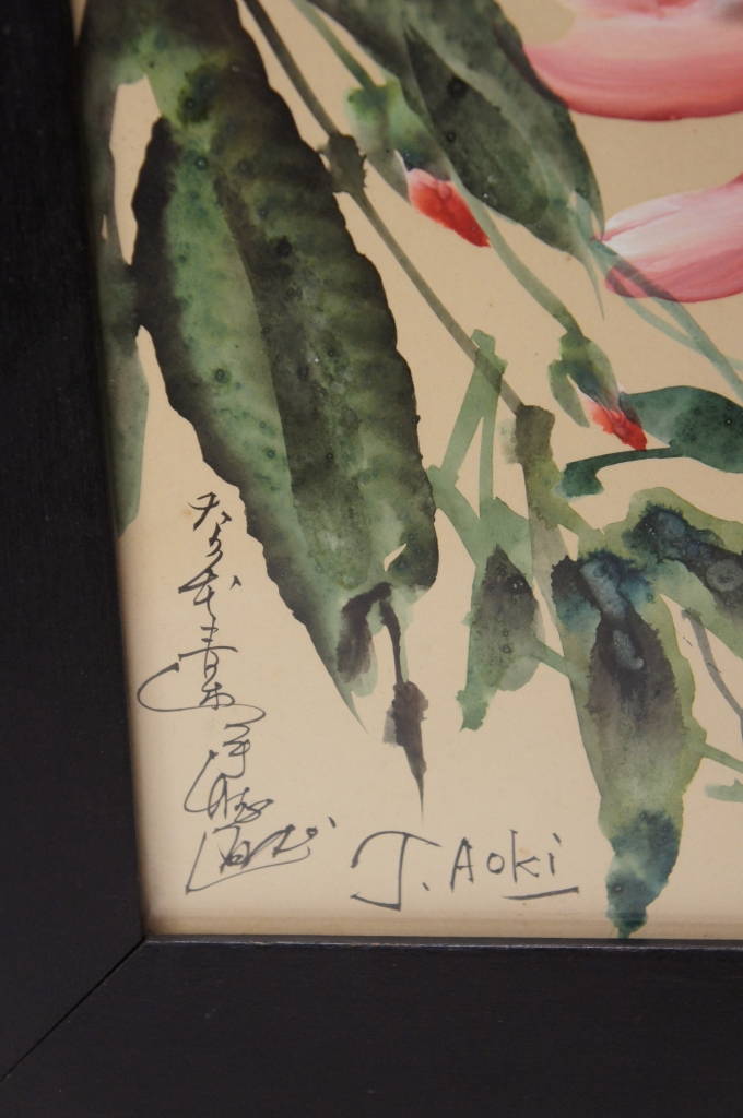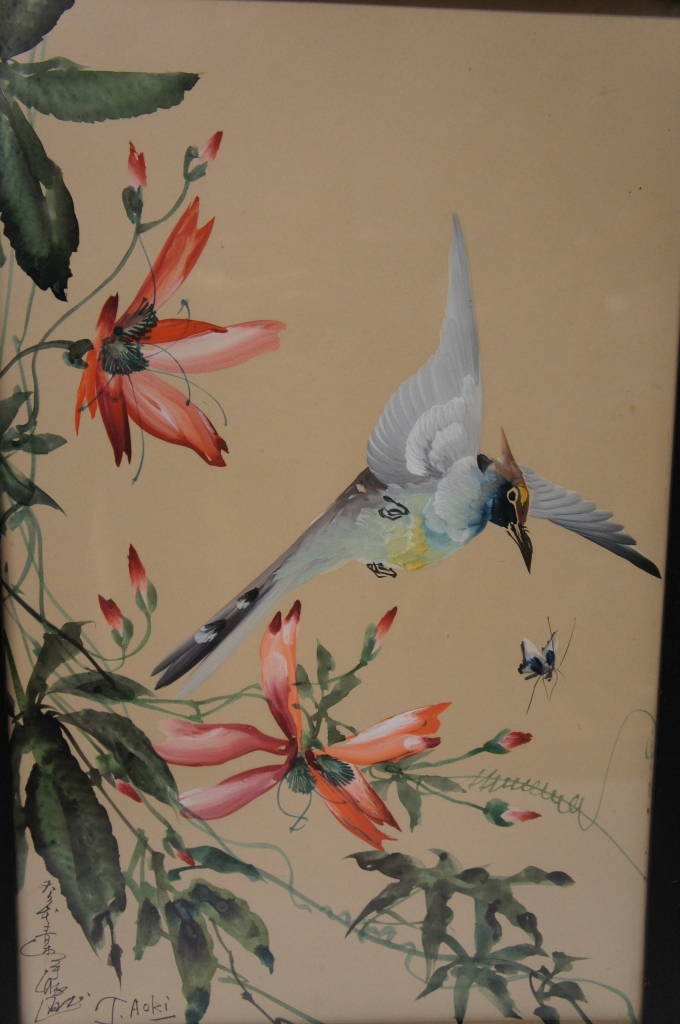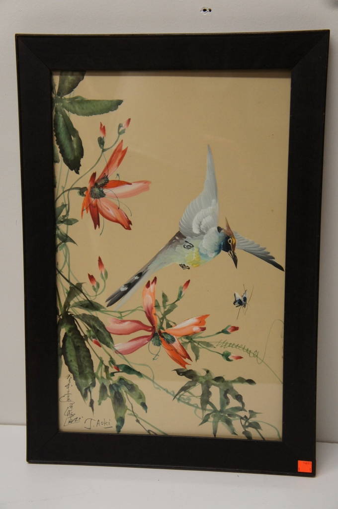 Toshio Aoki was active/lived in Japan.Toshio Aoki is known for painting. A lovely watercolor featuring hummingbirds and flowers
