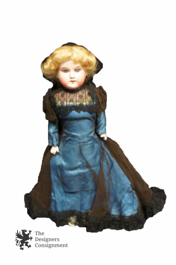 19th century bisque doll. Leather body, and beautiful formal clothing. Blue silk with black lace as well as feathers on the hat.