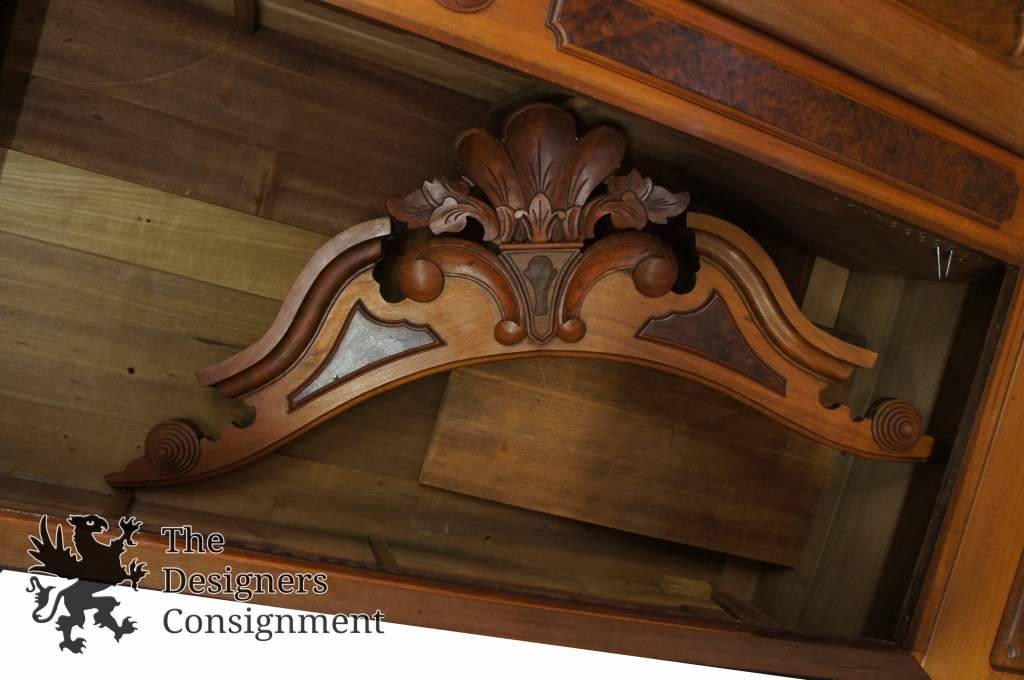 A magnificent piece of Eastlake Furniture that will addgrandeurto any room.Made from walnut burlwood with carved accents. You will notice that there are only a few photos with the finial on top as it is larger then our ceiling space and difficult to see. Inside is plenty of room for storage. There are 4 large removable porcelain casters. In addition there are 4 keys for each of the four locks. One of the keys does not work and in place for looks.