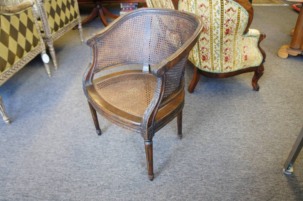 Vintage French Bergere Louis Xv Style Mahogany Caned Barrel Chair Acanthus Seat