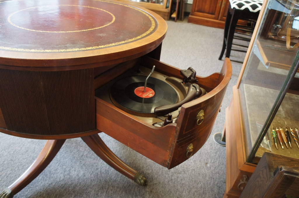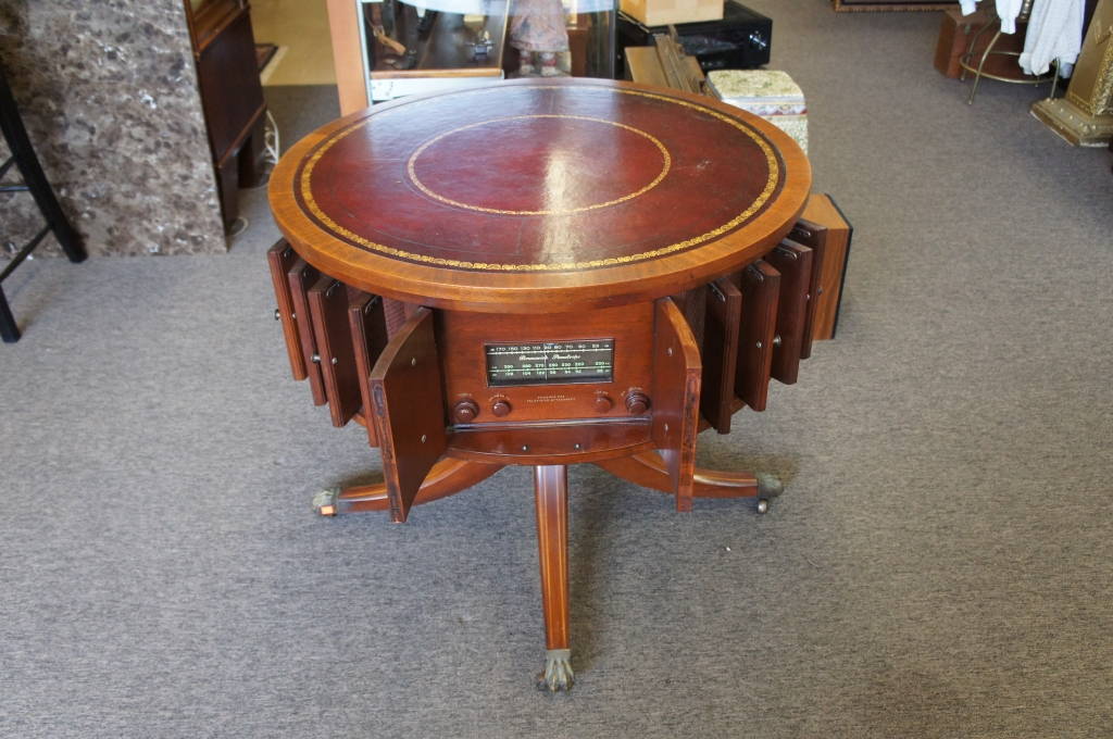 An extremely rare piece that both fits the aesthetic and musical value for any collector. Complete with a radio, phonograph andauxiliarycapabilities. Made from Mahogany with a red leather top. Inside are 2 speakers that sound great, but could also easily be updated. I have only found one other inexistenceto have sold making this piece a rare gem.