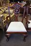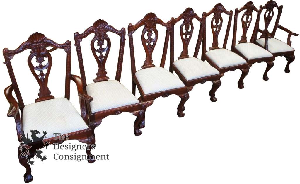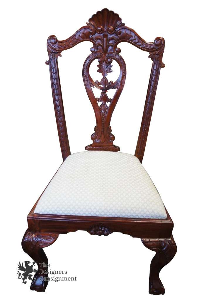 A stunning set of dining chairs. Made from solid mahogany with Chippendale styling and a rosewood finish. Features an intricately carved back with a scallop shell at the top leading into acanthus leaves. The legs are of Queen Anne style terminating into ball and claw feet. A great addition to any home