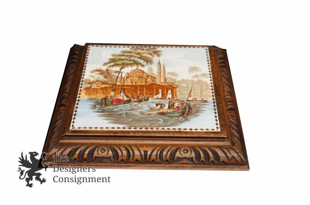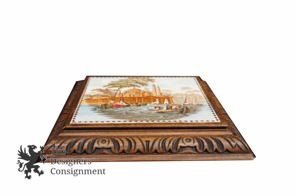 A great piece for any wall or table. Features 4 feat on the bottom allowing it to be placed on any surface, or it can be hung on the wall. It is porcelain, and the subject matter features boats sailing towards a city. It would appear to be a European city, possibly greek or roman.