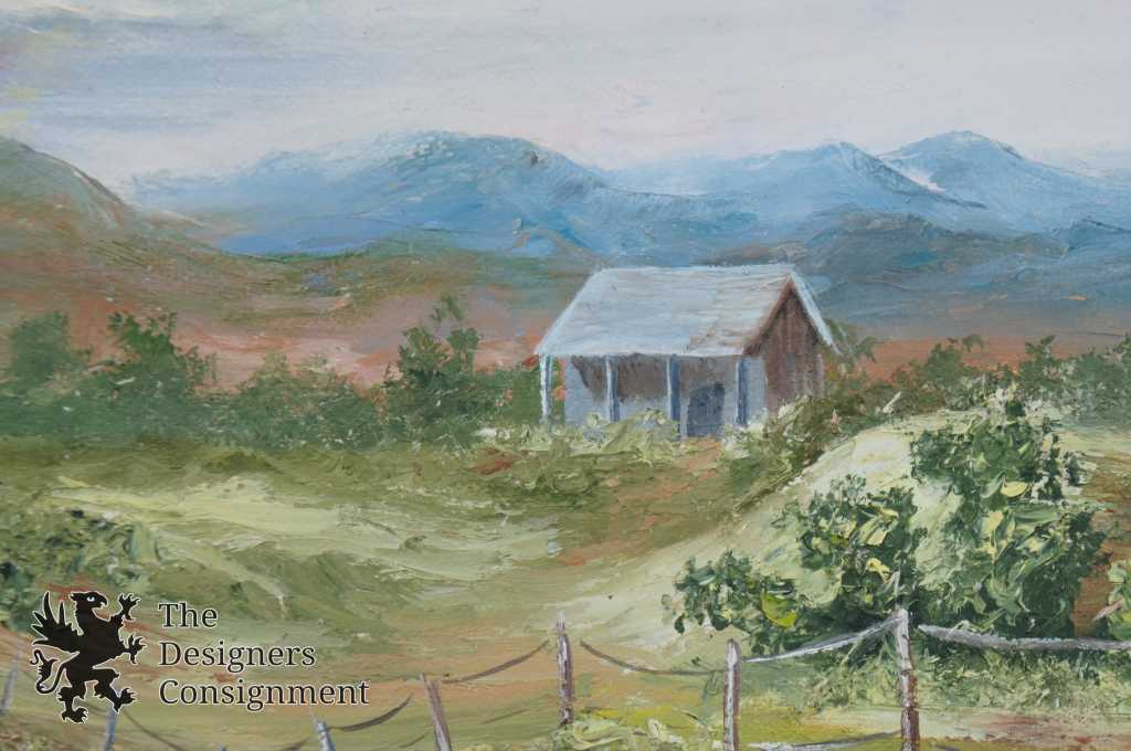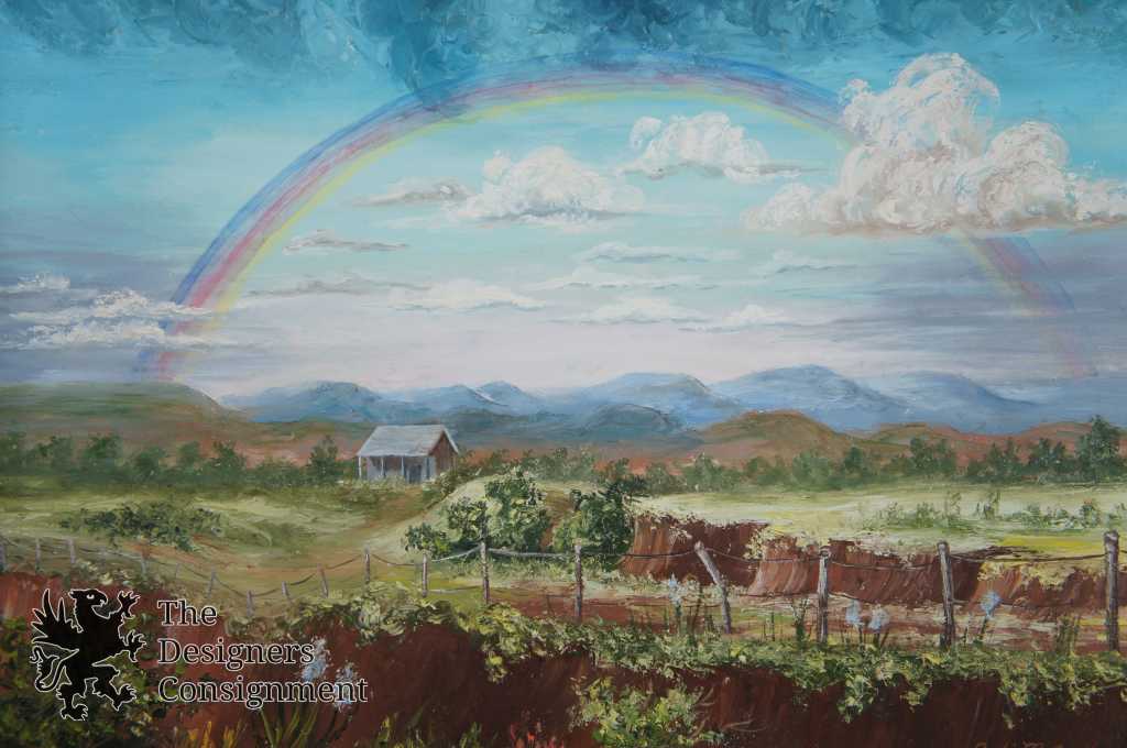 A fun piece of art featuring a rainbow over a ranch. Bright color and beautiful detail