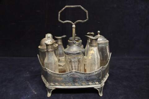 Victorian Cruet Condiment Set 8 Silverplate Etched Glass & Crystal Art Nouveau