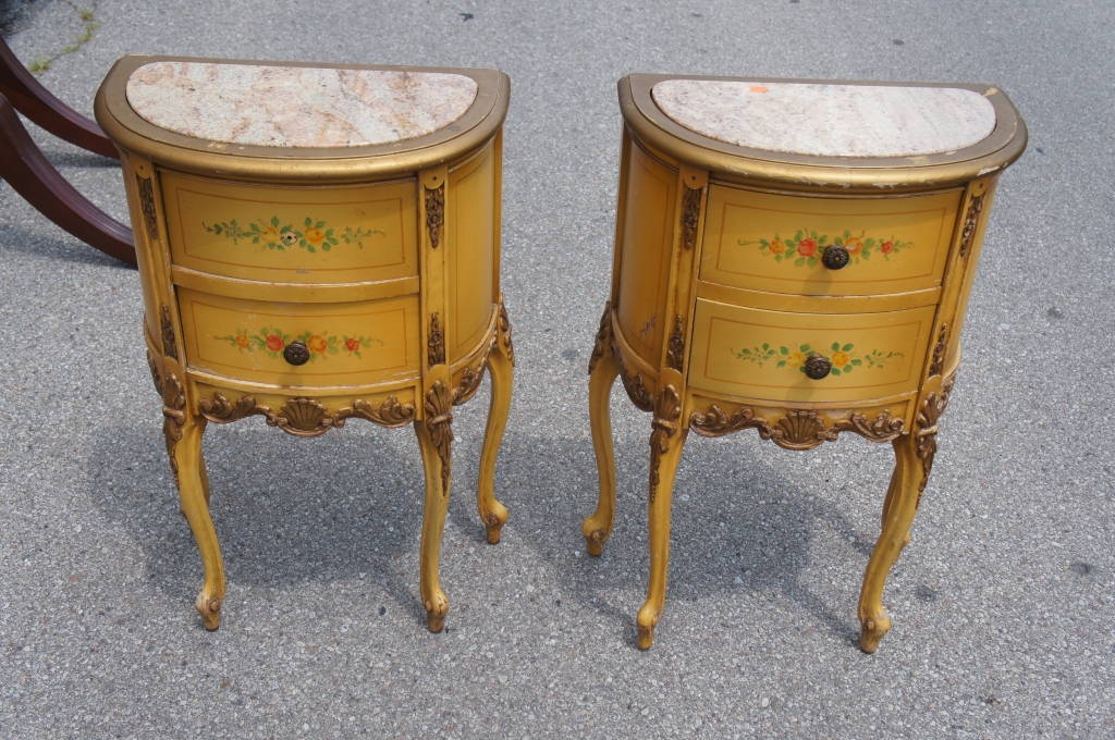 2 French Country Demilune Marble Top Nightstands Floral Painted Louis Provincial