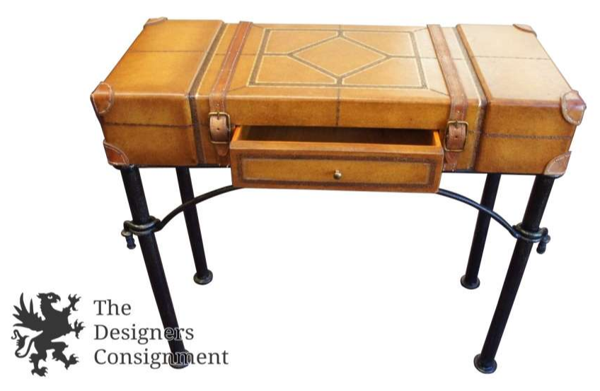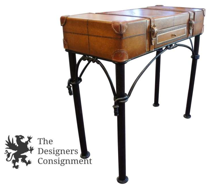 Vintage French Style Leather Trunk Case Accent Table With Iron Base Console
