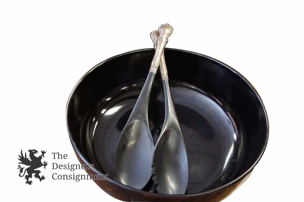 Mid-Century Towle Black Melamine Sterling Mounted Salad Bowl w Serving Spoons