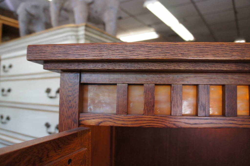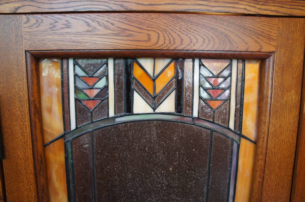 Arts & Crafts Mission Cabinet Leaded Slag Glass Doors Illuminated Vtg Oak