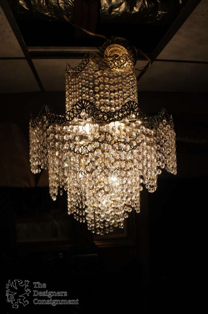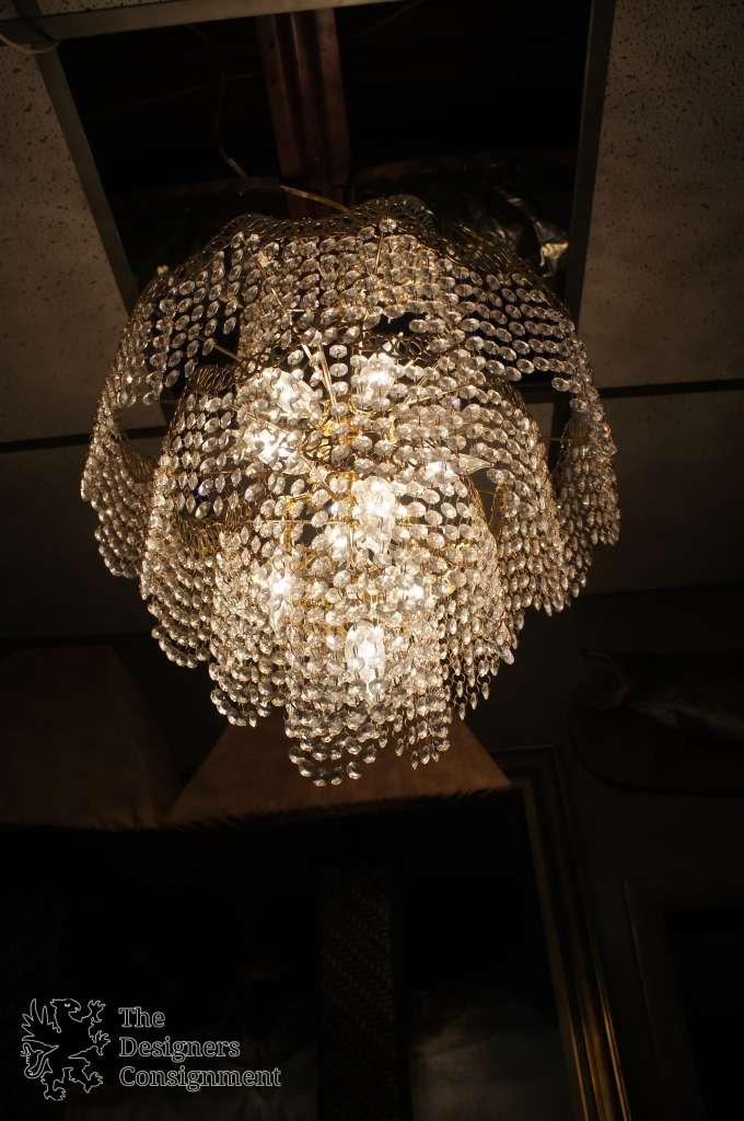 5 tier layered brass & crystal chandelier. Perfect for any setting.