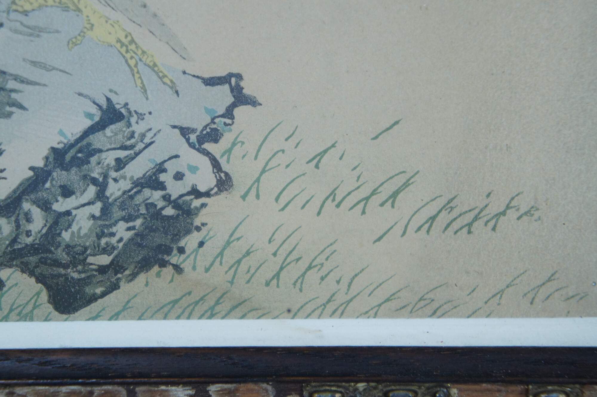 Late 19th - early 20th century Meiji period Japanese woodblock print featuring a pair of male and female Chinese Pheasants seated under a cherry tree, by Imao Keinen. Print appears to be marked or pencil signed in Latin characters under the printed seal in the lower left corner (partially obscured by mat). Plain wood frame with carved detail; white mat.