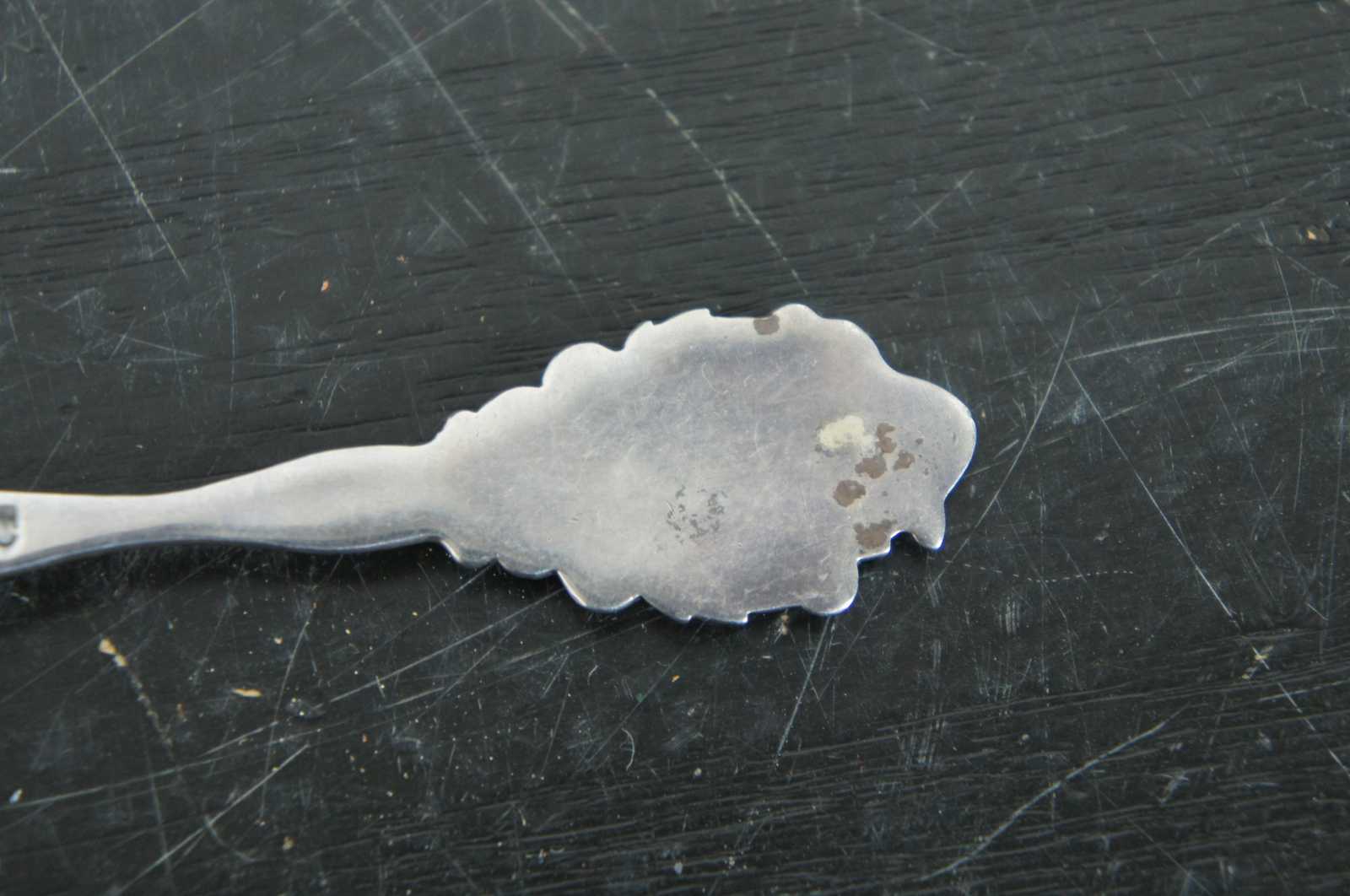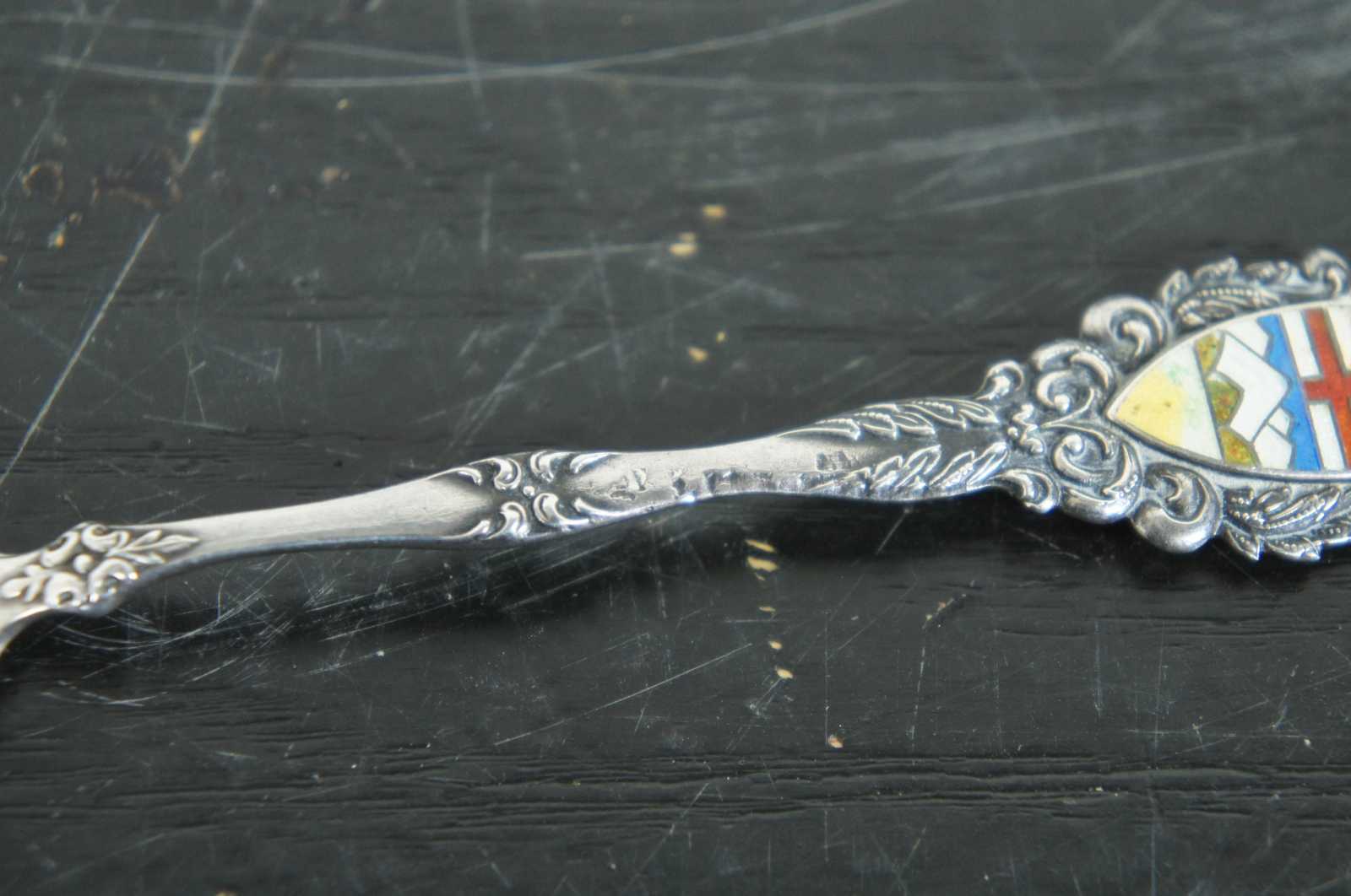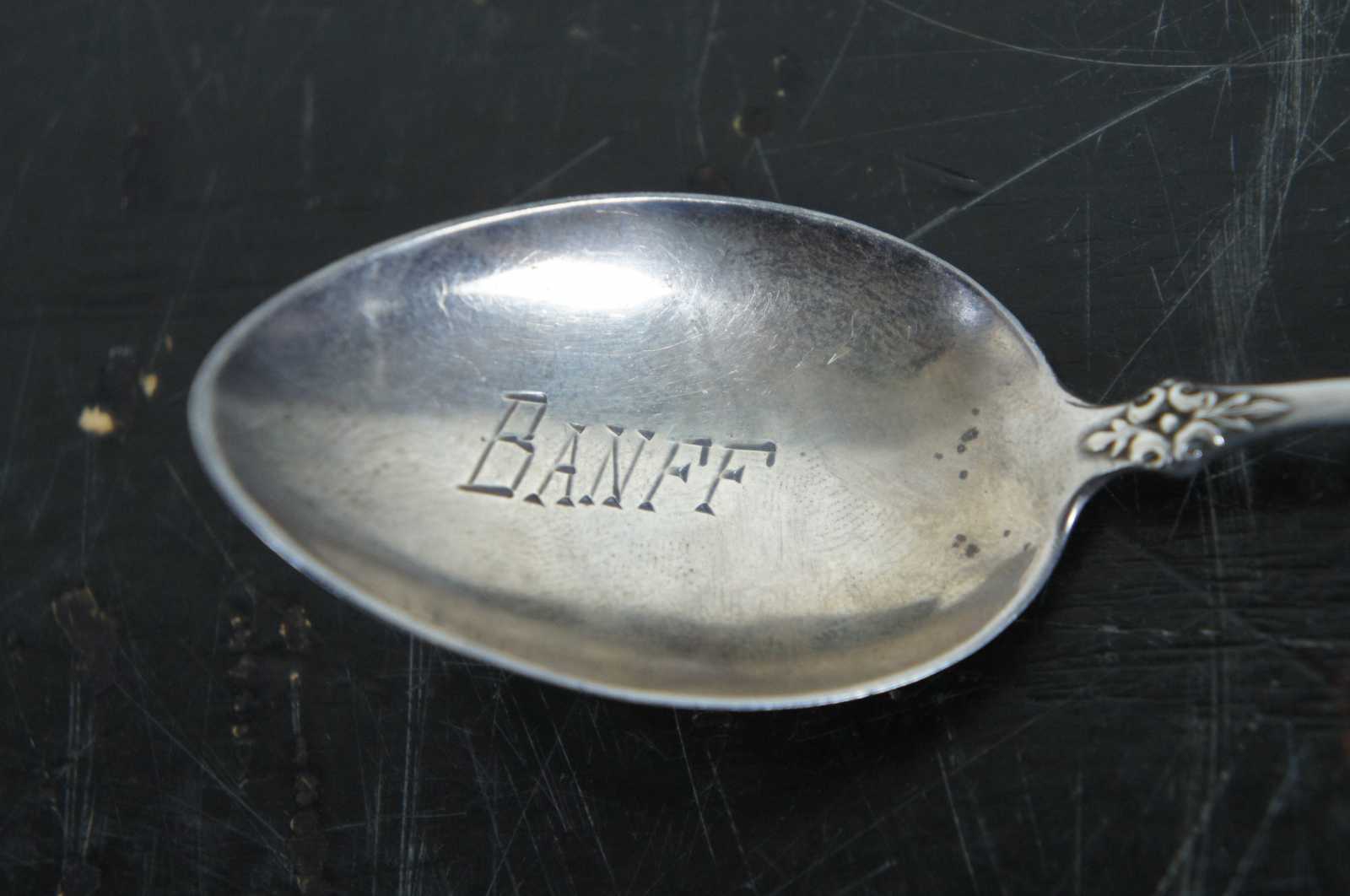 Antique sterling silver .925 spoon with engraved in the bowl Banff (Town in Alberta Canada), topped with a beaver above an enamel crest featuring a red cross and a mountain landscape. Marked sterling on backside. 5.375" and 19 grams.