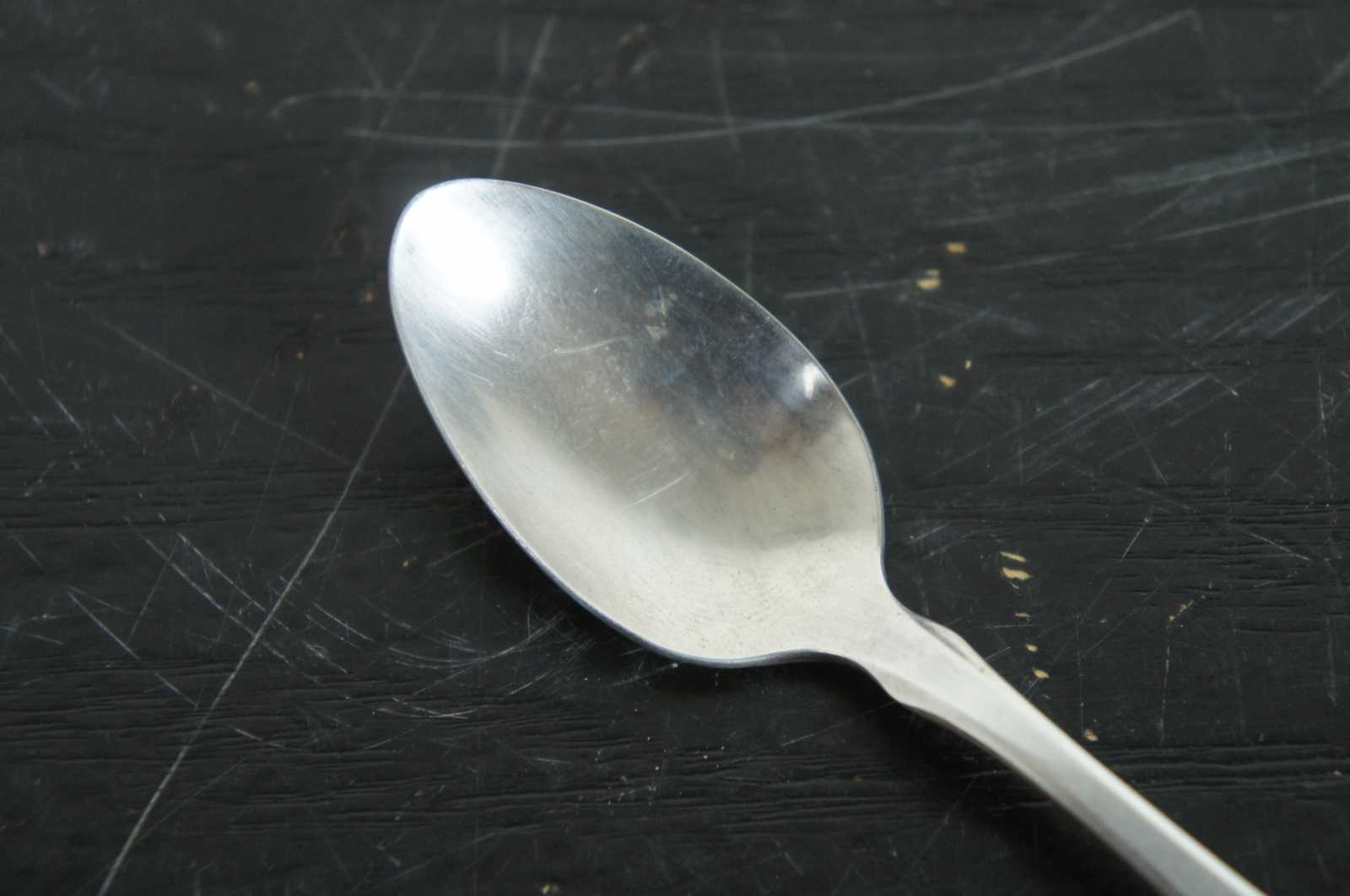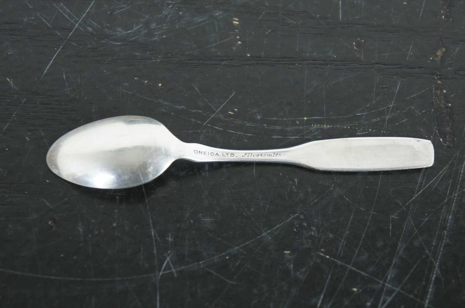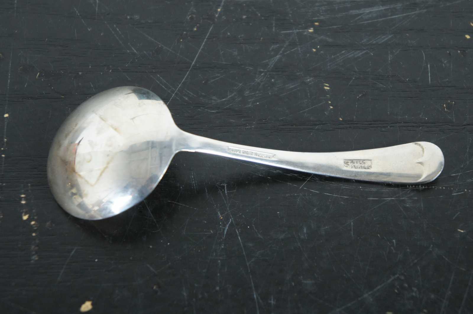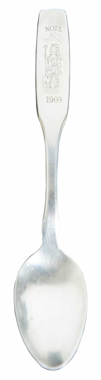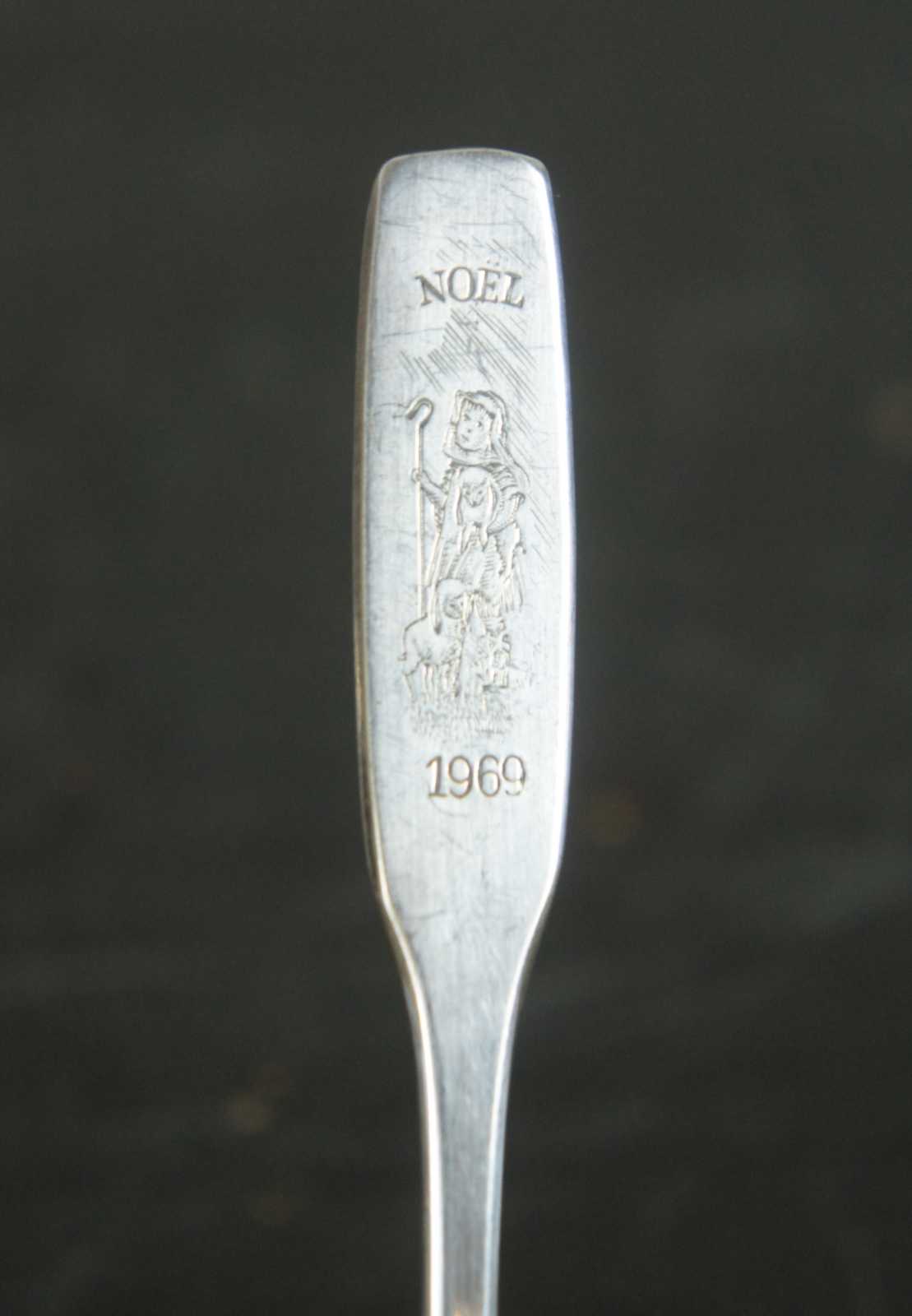 Pair of mismatched vintage spoons – Oneida Silversmiths Noel 1969 collector’s spoon with an engraved shepherd and an unknown brand English silver plate soup spoon.