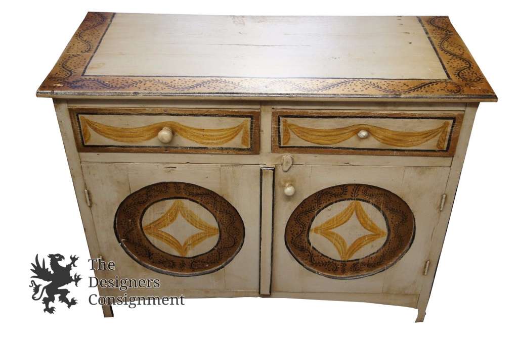 Fair condition, some holes on the top and sides of the piece. One drawer pull has come off of the top right drawer, but can be reattached.