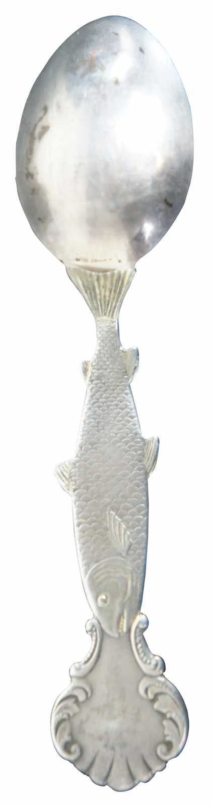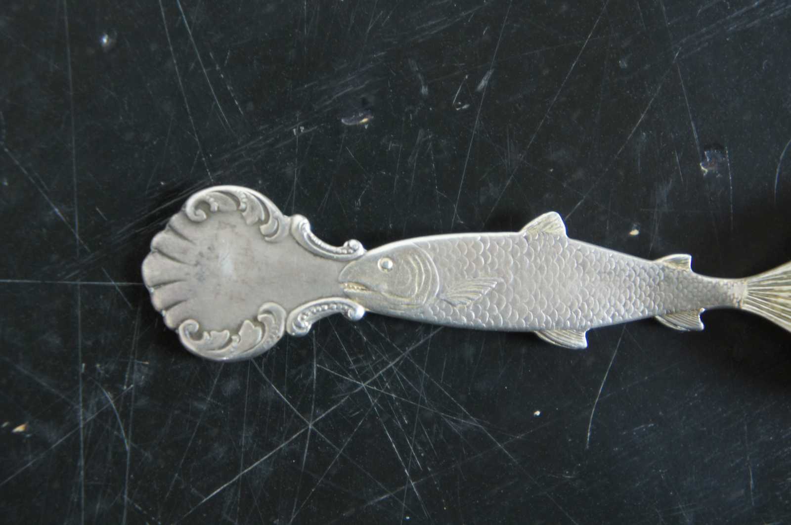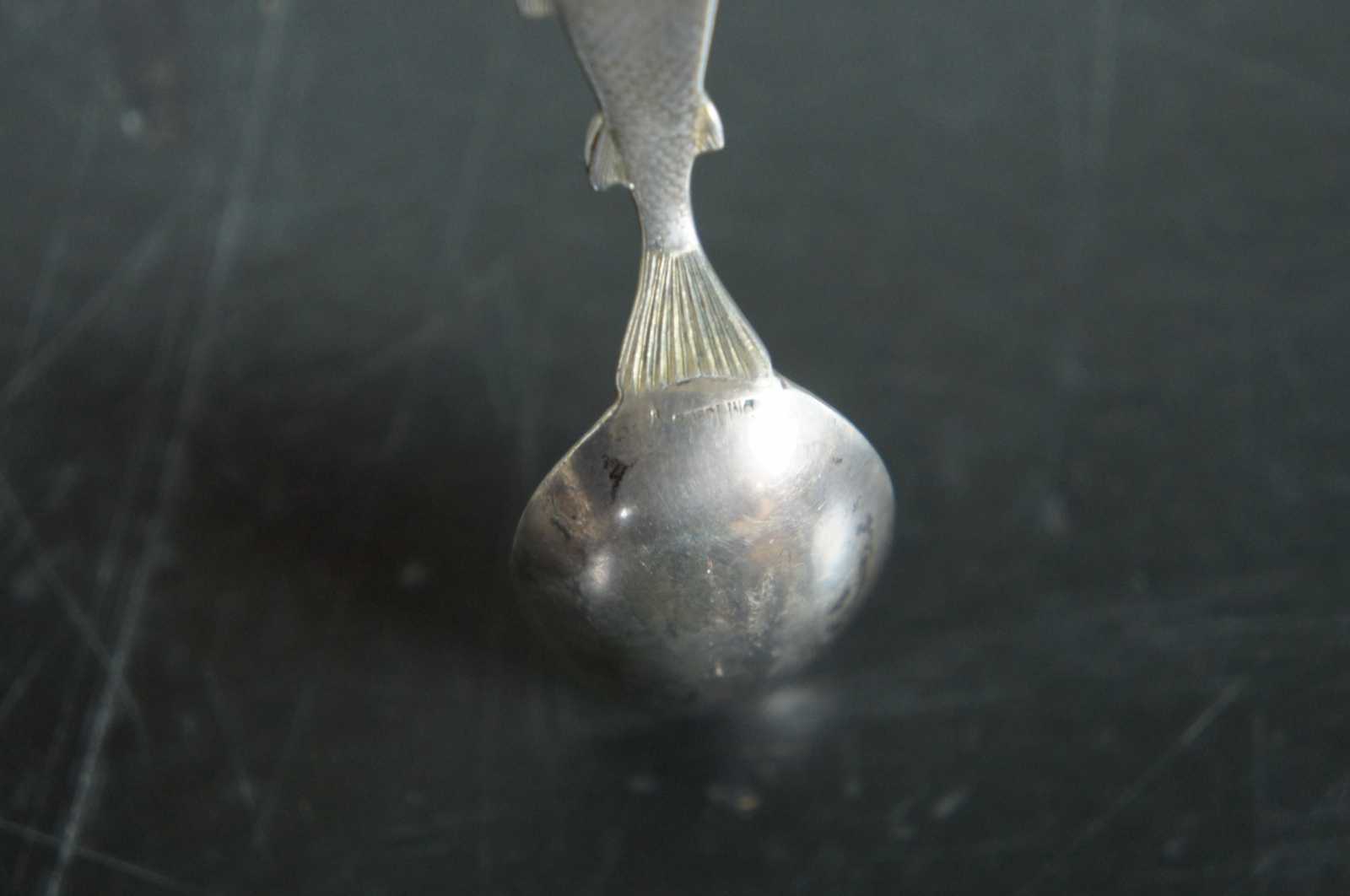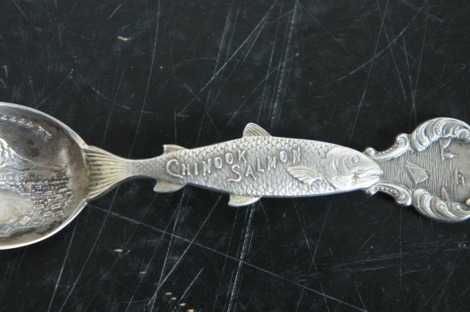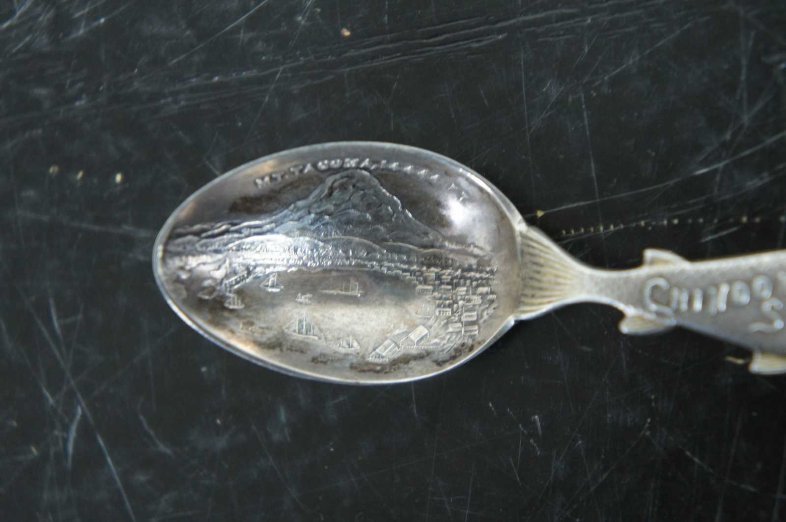 Antique Seattle, Washington, Mount Tacoma and Chinook salmon sterling silver 925 souvenir spoon. Features a veiw of the mountains and the surrounding harbour with nautical ships, structures and landscape. Marked Tacoma 14444 ft, Sterling.