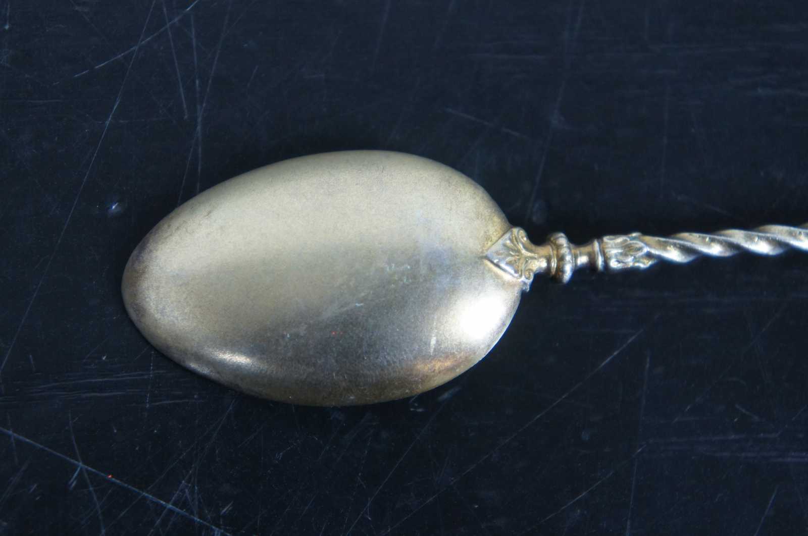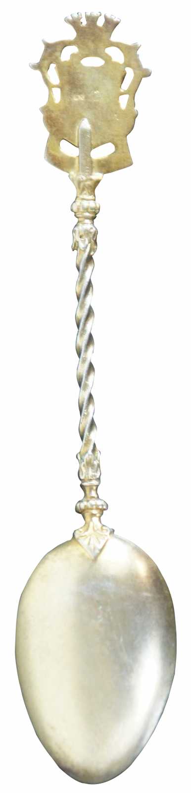Antique .800 silver enameled German souvenir spoon, the bowl showing a view of a statue in a square with “Berlin Bismarck-Denkmal” above and a twisted handle crowned with a black bear griffon rampant.