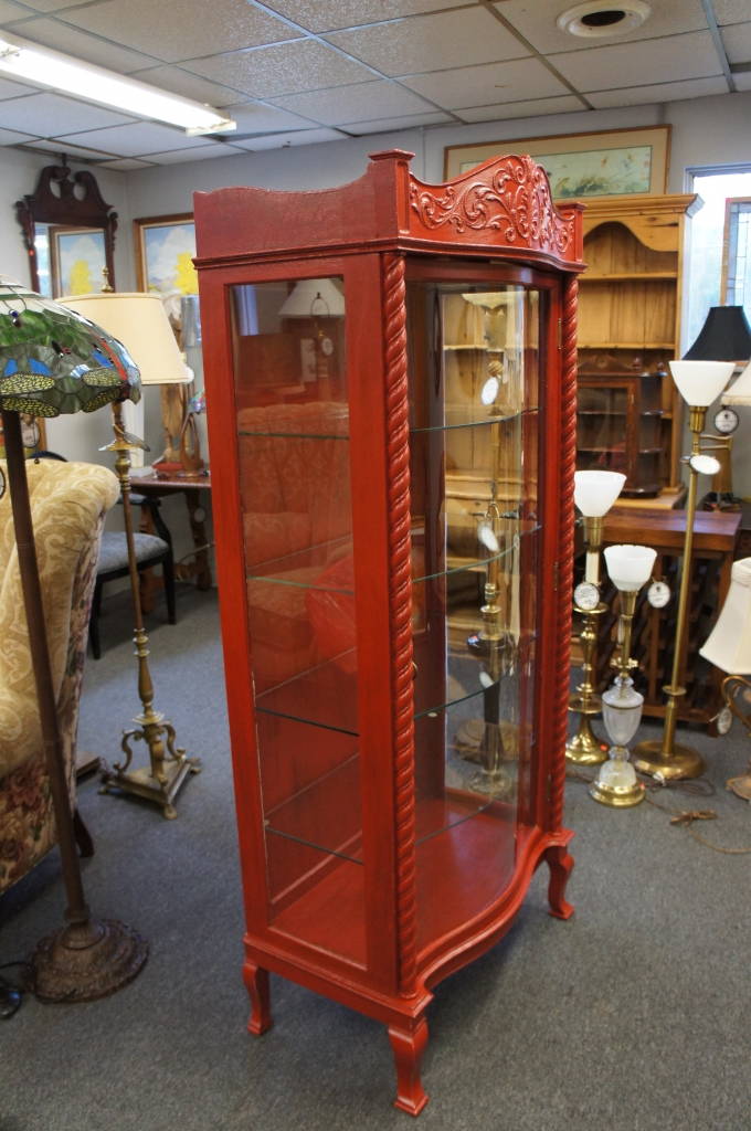 Antique Red Painted Oak Bow Front Glass Curio Cabinet Carved Arts + Crafts Light