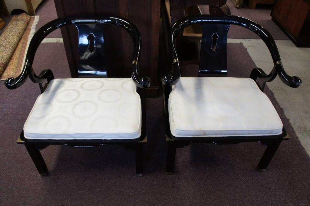 James Mont Campaign Style Black Lacquer Ming Horseshoe Back Lounge Chairs Vtg