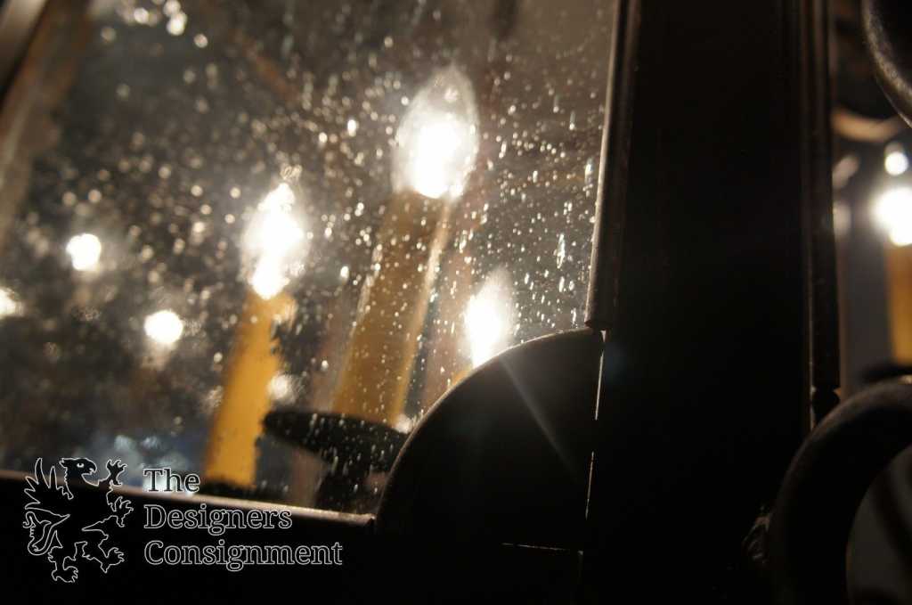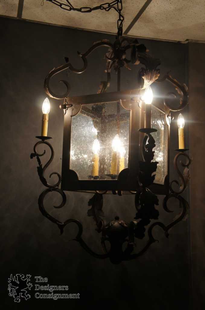 A Stunning hand forged iron chandeleir by Arte de Mexico. Made with antiqued glass. This light features 8 lights in a unique carriage lantern style design. Accented with acanthus leaves that meet at the lower finial to top off its beautiful rustic look. A statement for any setting.