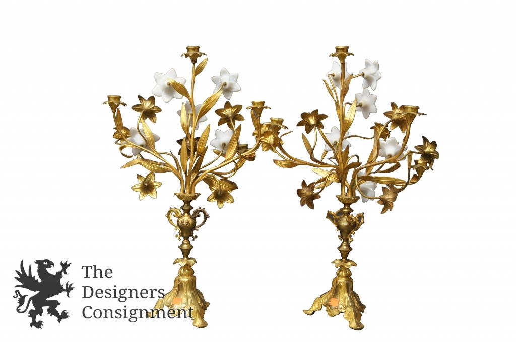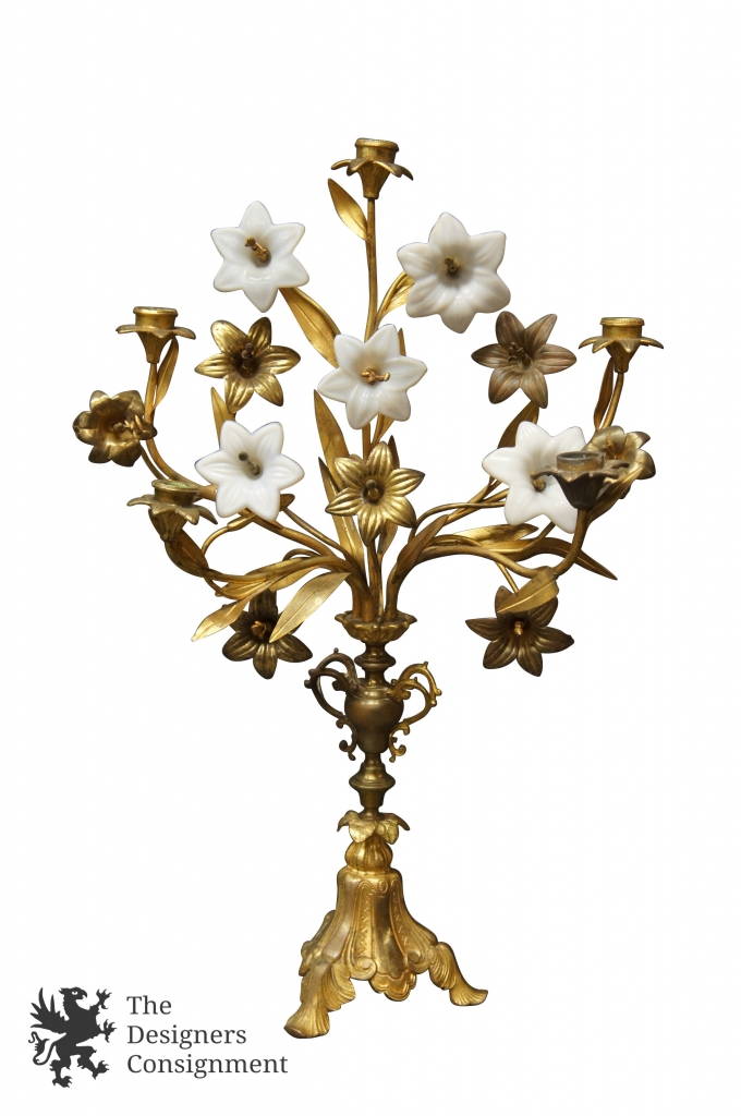 2 Antique French Brass Floral Altar Candelabras Glass Lilies 5 Light Nouveau
