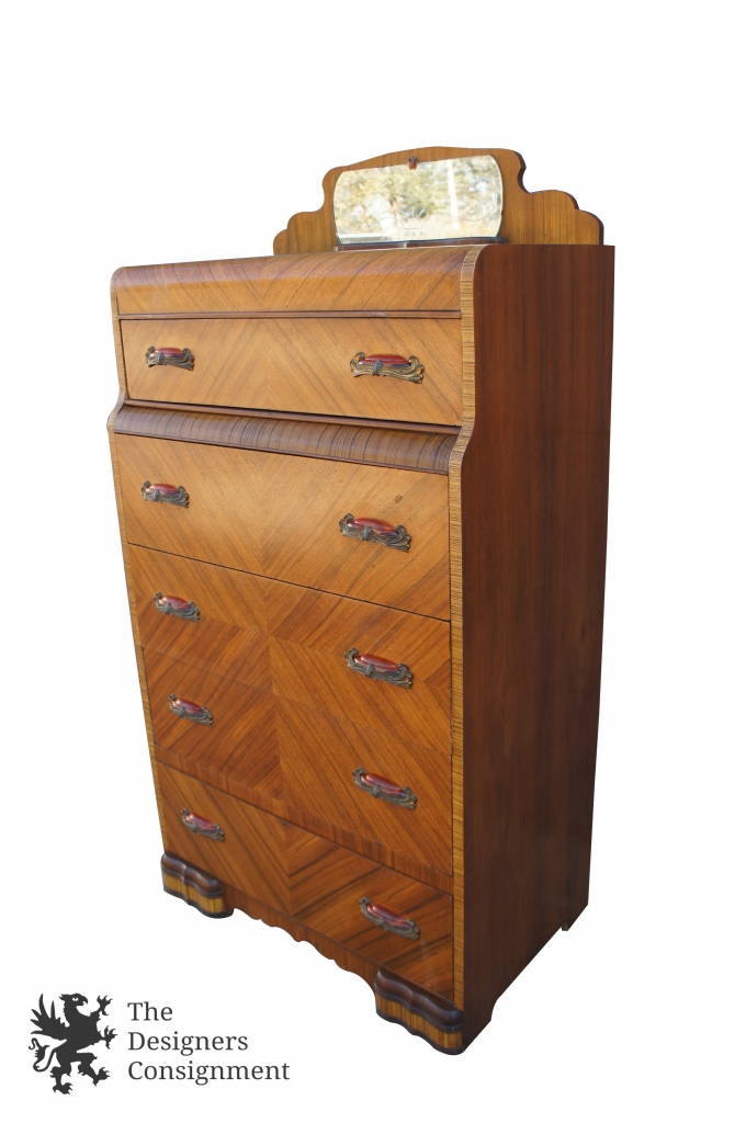 Early 20th Century Art Deco Waterfall Tallboy Dresser 5 Drawer + Mirror Bakelite