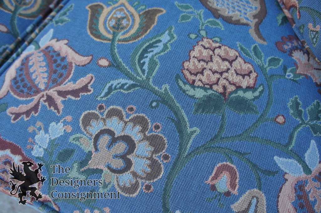 Traditional styling with a vintage blue floral upholstery, and Mahogany feet.