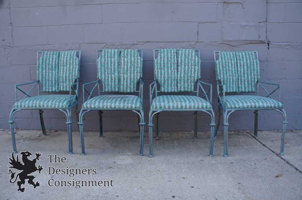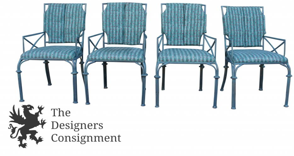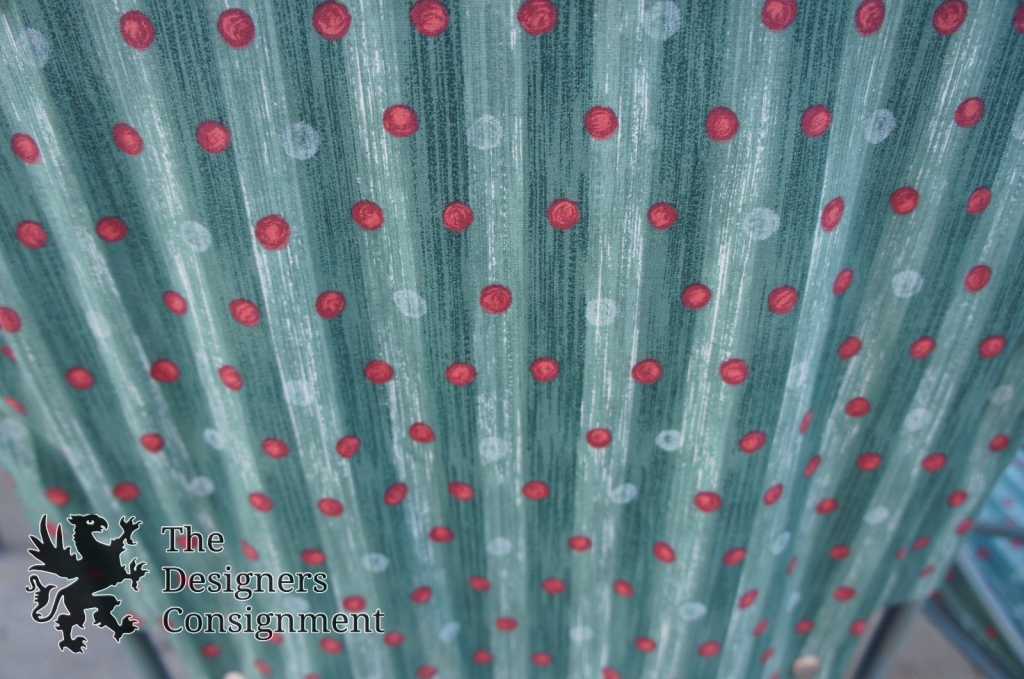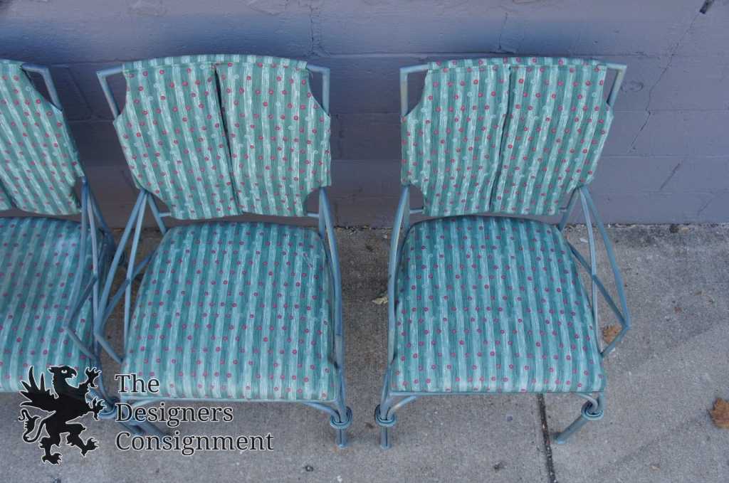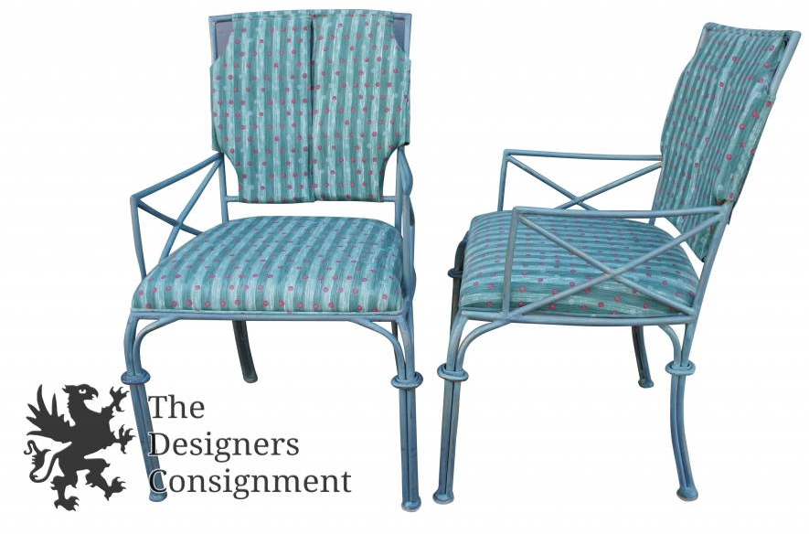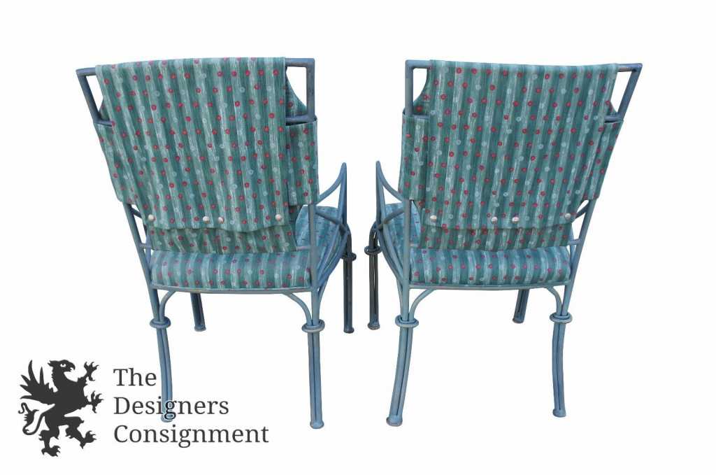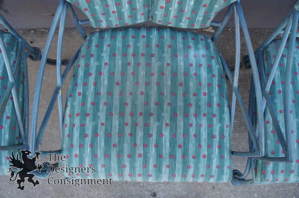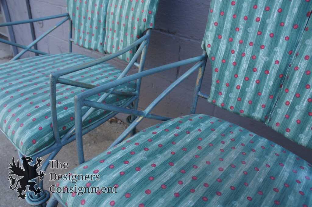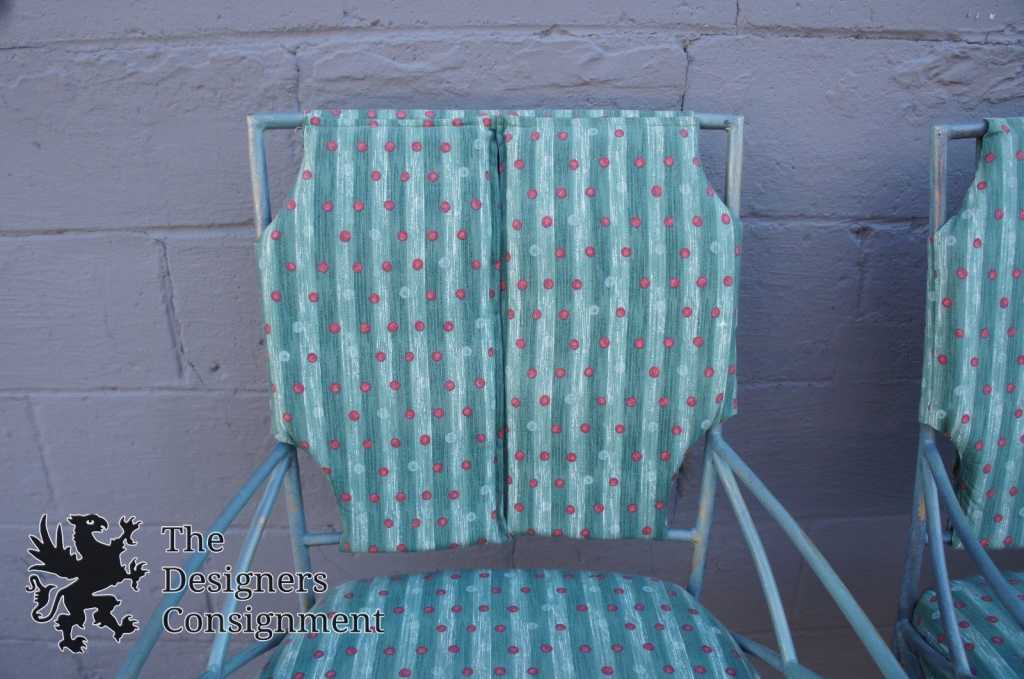 A great set of chairs for any patio or porch. Made from wrought iron with a turquoise finish. If you look closely you will see that turquoise is accented with gold distressing. Finished off with a green and red polka dot upholstery.