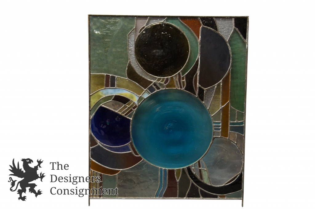 Mid Century Modern Geometric Abstract Slag Glass Stained Window Panel Iron Frame