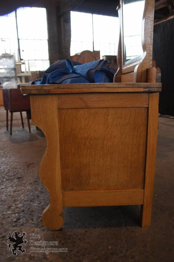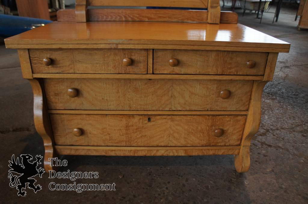 A unique early 20thCentury Empire style dresser. Made by Sam T. Howe Pre-1930's in Carlisle Kentucky. Complete with scrolled accents along the edge of the dresser and mirror. The casters are easily removable depending on intended use. A great addition to any collection.