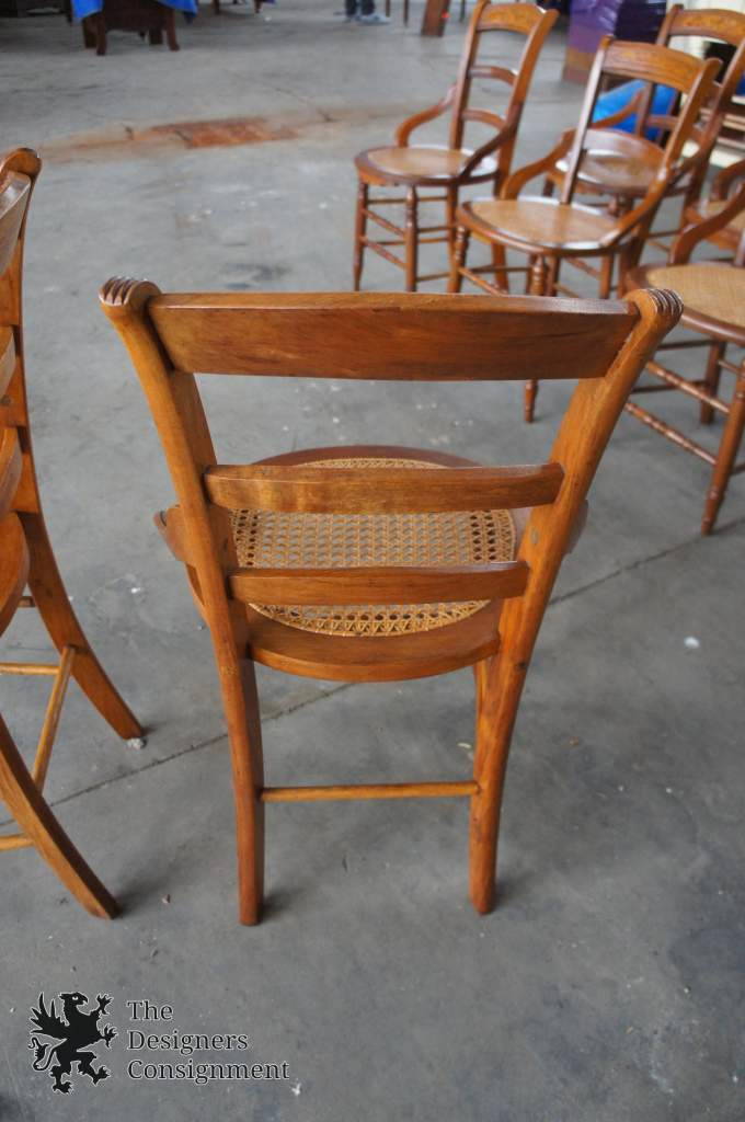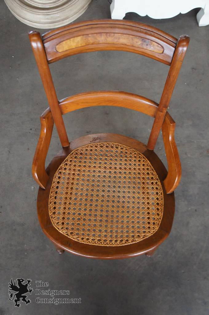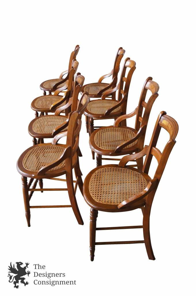 A beautiful set of 8 Victorian dining chairs. Each features a nice burlwood panel on the top of the seat back. 3 of the chairs have slight variations along the trim that connects the seat and back.