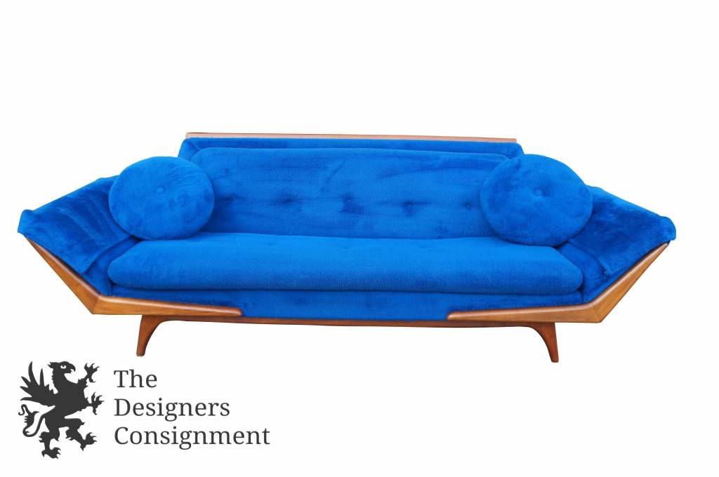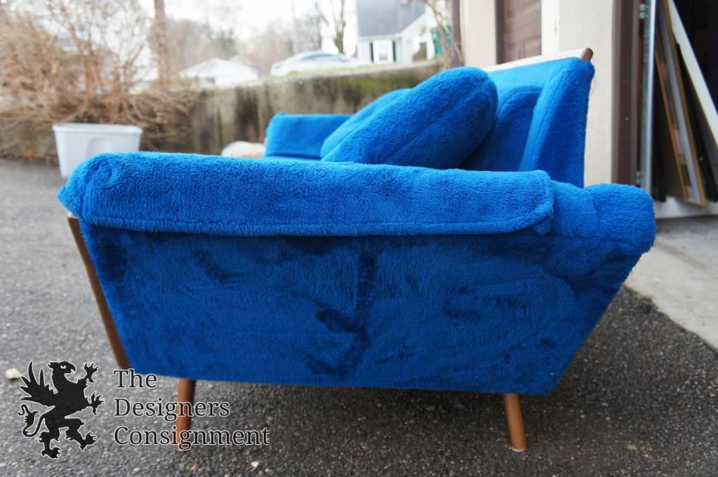 A Classic Modernist sofa by Rowe Furniture. Circa 1967. Features a blue felt upholstery, trimmed in Walnut. Matching chair and ottoman available if interested.