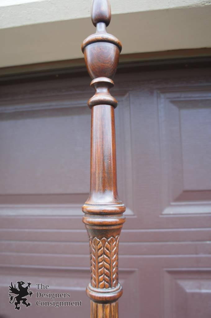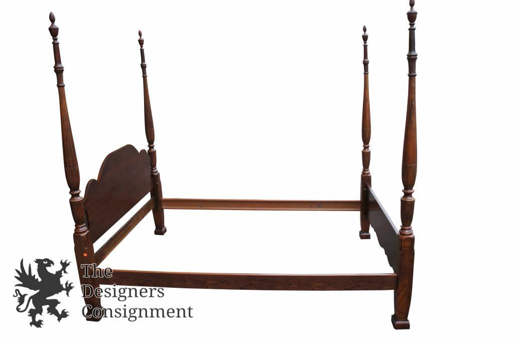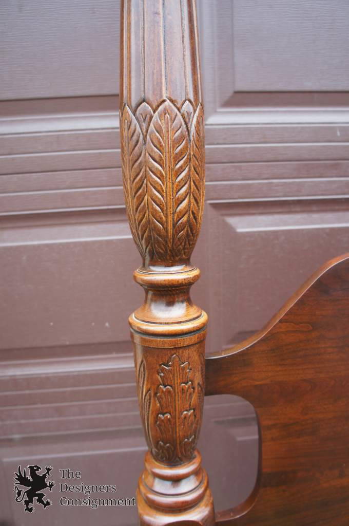 4 Poster Mahogany Queen Size Bed. Sheraton Style with Rice Carved Posts. Finials can be adjusted to fit smaller rooms.