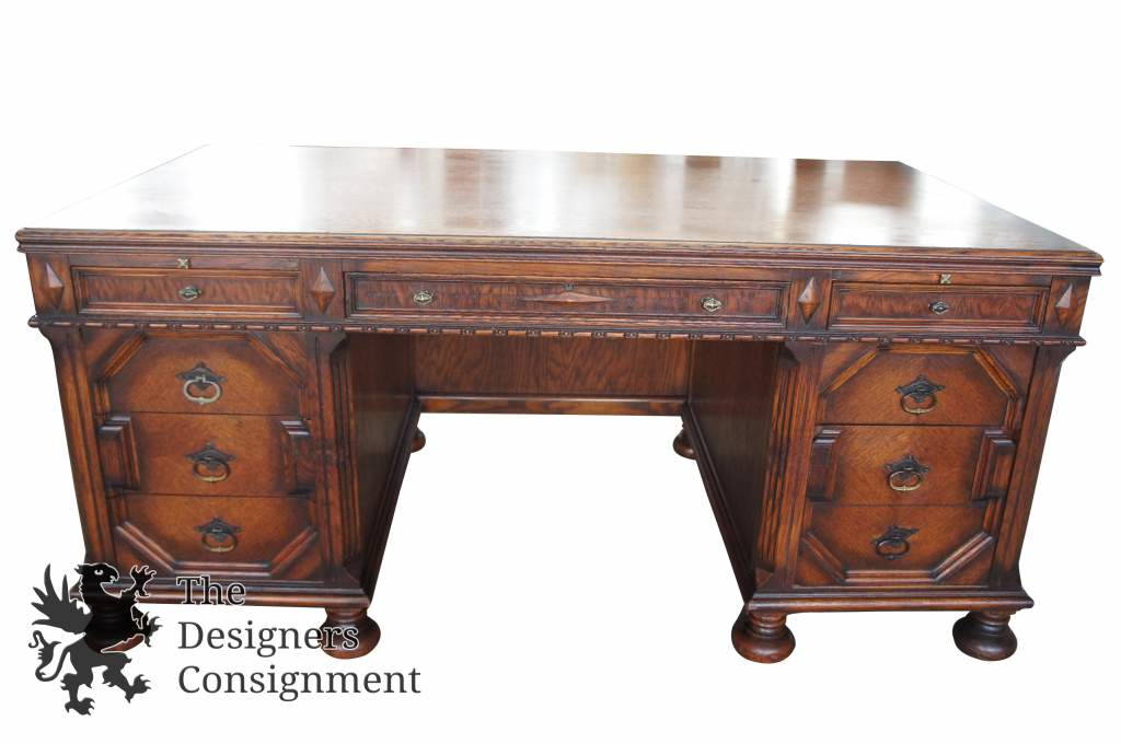 Mid Century Jacobean Revival Solid Oak Carved Executive Office Desk 66" Vintage