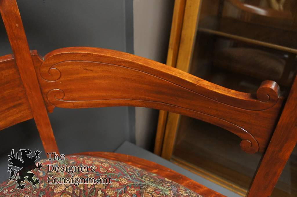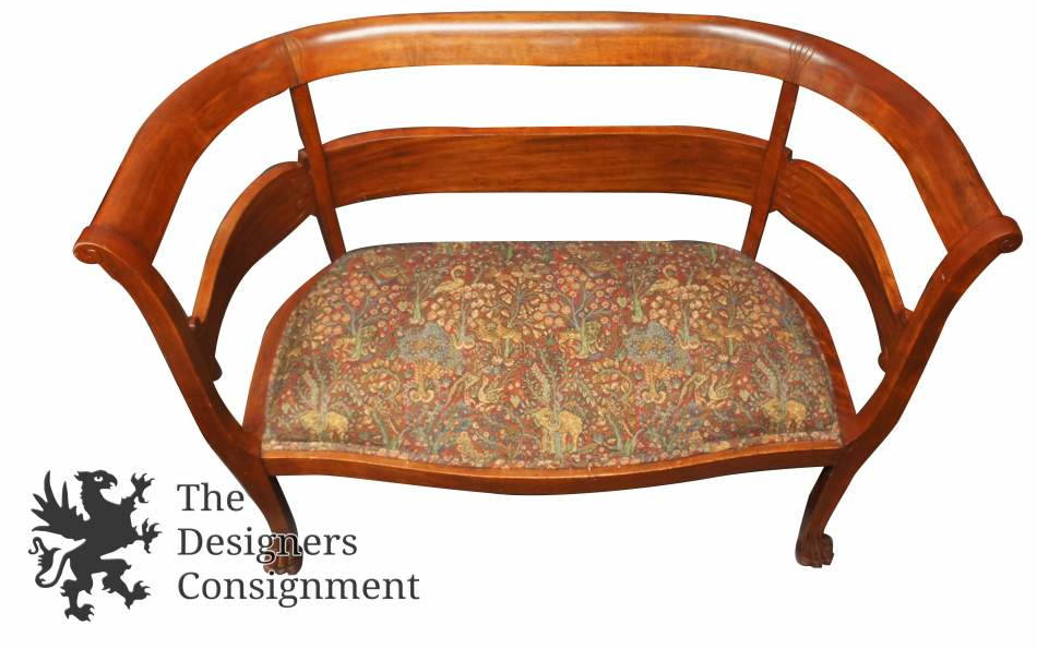 Features a smooth Mahogany rounded back with carved accents and paw feet. Upholstered with an animal print.