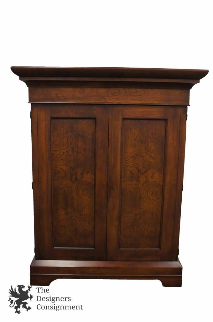 A Gorgeouspiece by Romweber a company known for its long history of durable furniture lines. Made from Mahogany with burled front door panels. Traditionally styled with a lock and key. On the inside this piece is built to be used for entertainment, and storage, however it could easily be converted with an interior bar for hanging clothes and other garments.