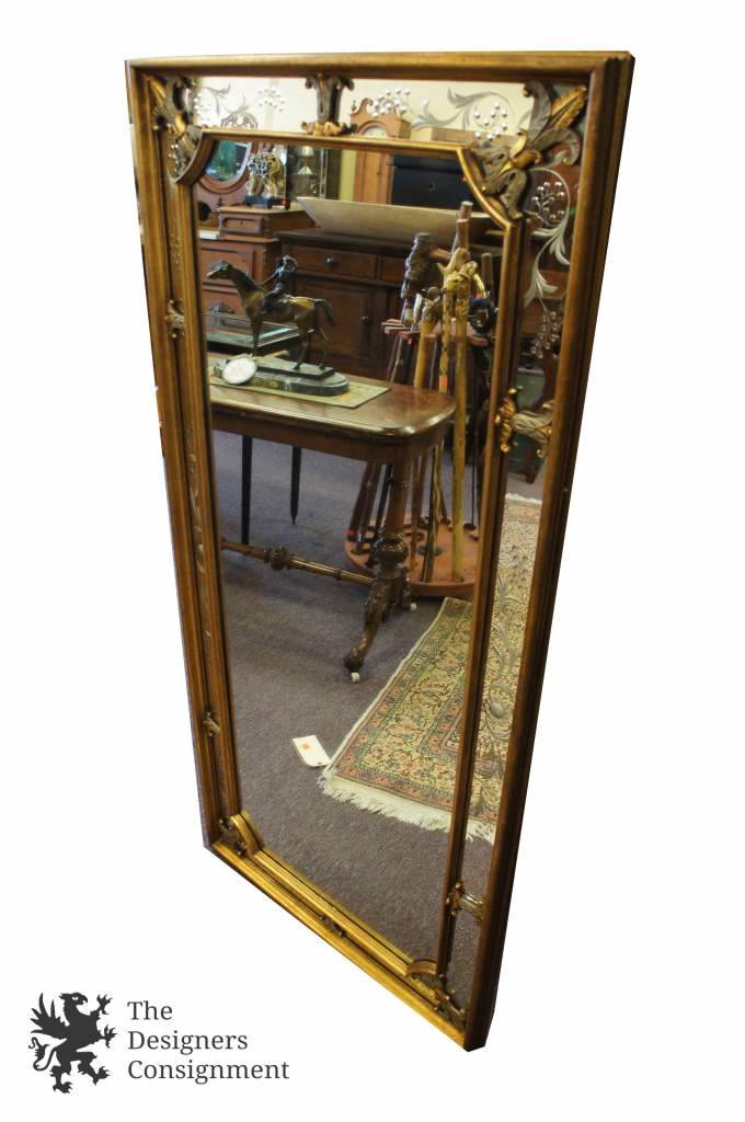 The perfect mirror for any setting. Venetian style with etched floral accents. The frame is gold painted wood with carved trim. The mirror is setup to hang vertically, but easily can be altered to hang horizontally