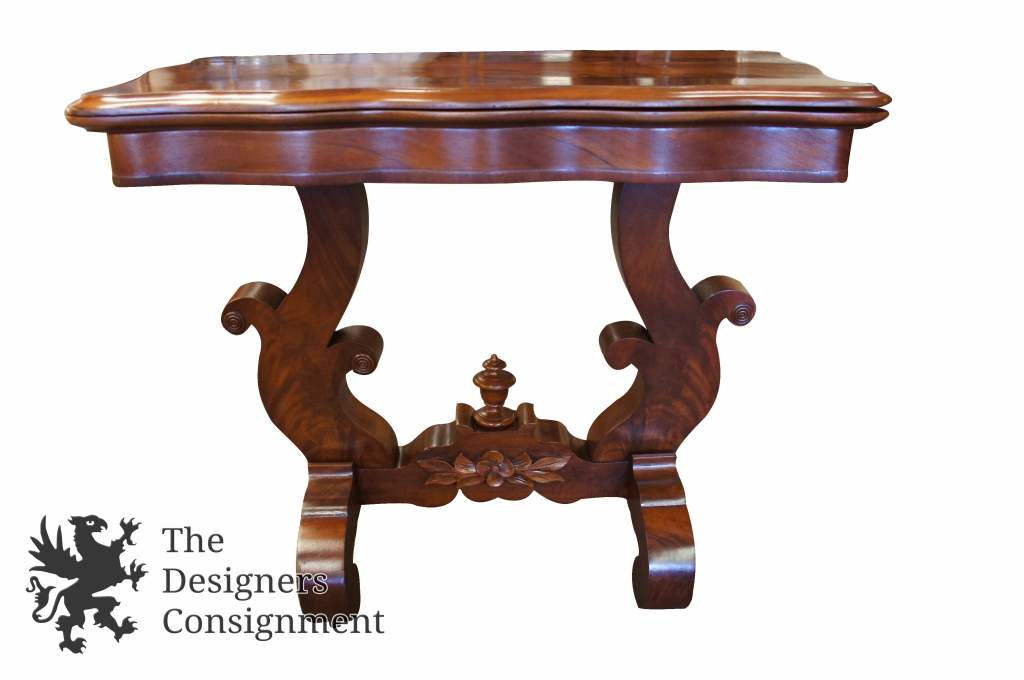 An absolutely stunning piece of Victorian furniture. Made from flamed Mahogany with exquisite attention to detail. A carved harp shaped base leads up to the serpentine top that swivels open into a game surface. The underside of the table is hand planed. A great addition to any setting.