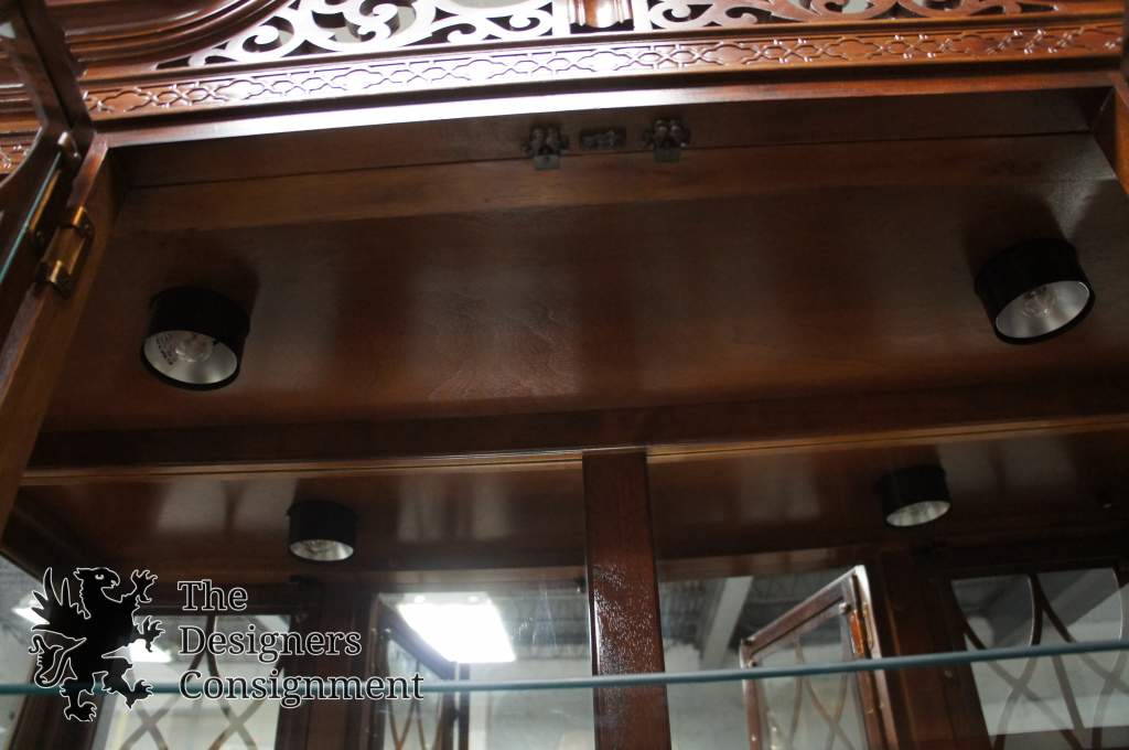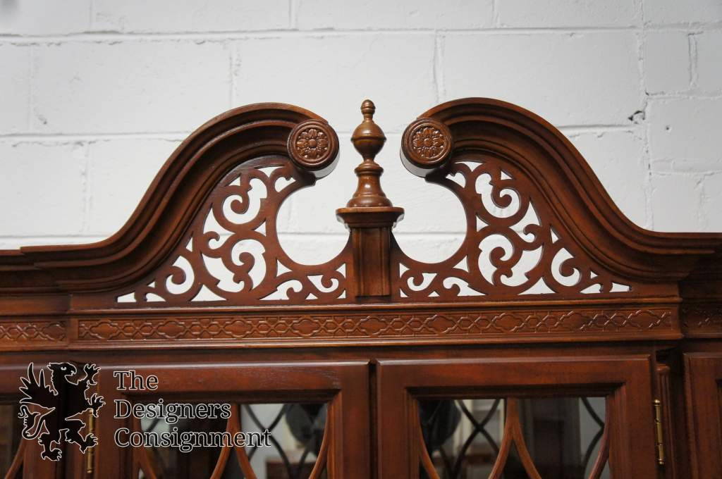 A beautiful looking breakfront with plenty of room for storage. Classic Queen Anne styling with a distressed Mahogany finish. An open Pediment crown aligns an illuminated top. The glass doors are coveredin intricatefretwork. A great addition to any setting!