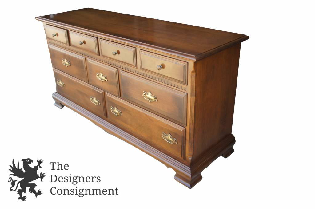 A great piece from Ethan Allen's Classic Manor Collection. Made from Maple in Colonial/ Queen Anne Styling. Features Castors beneath for ease of movement. The mirror is meant to be hung on the wall above the dresser.