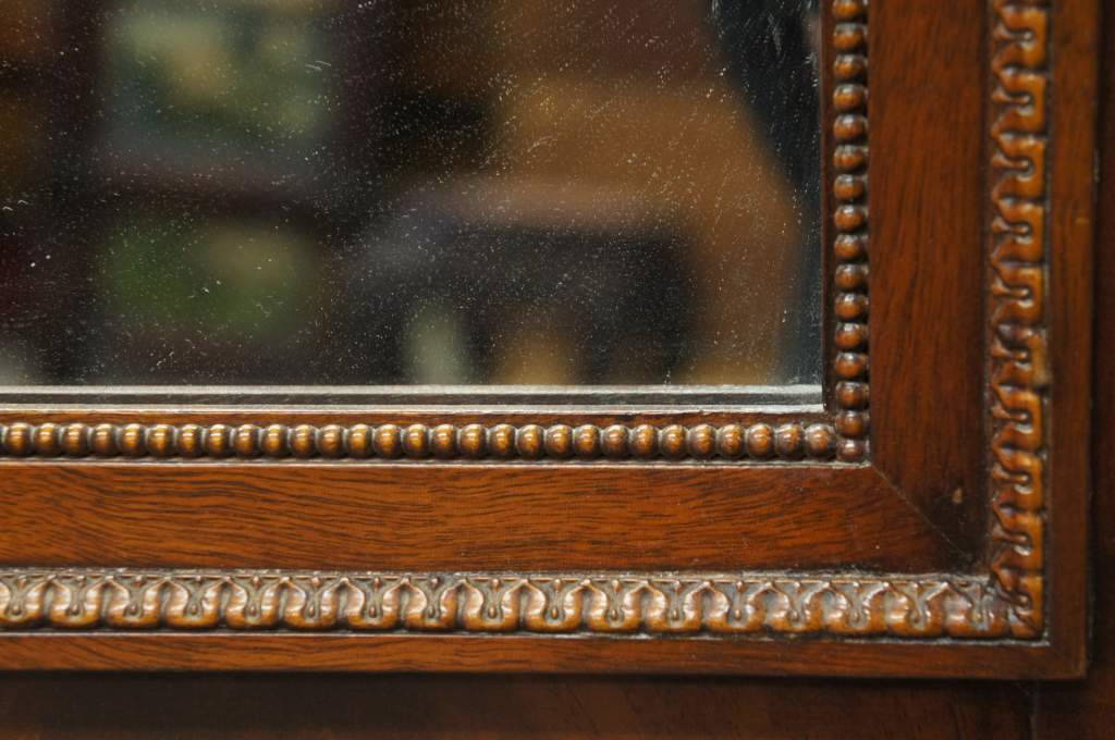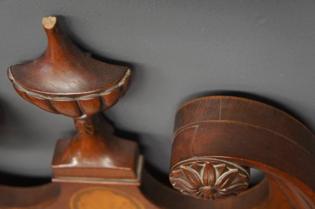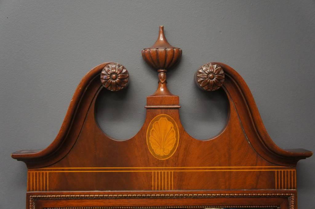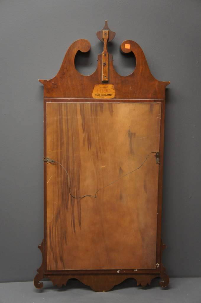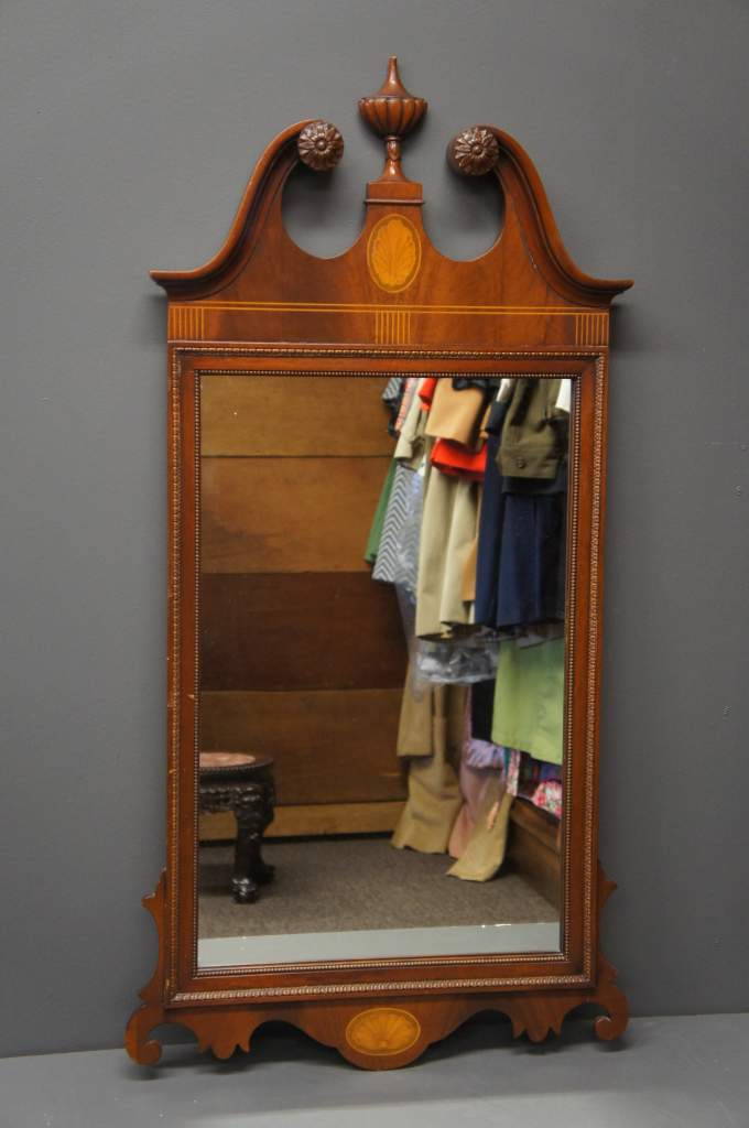 Mid Century Old Colony Sheraton Style Inlaid Flamed Mahogany Carved Mirror 46