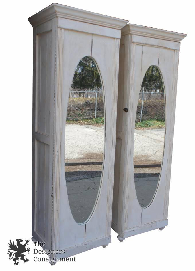 These beautiful cabinets were made from antique wood and are very solid. Each features a latching mirrored door. On the interior are 3 shelves. Each shelf is split and can easily be removed if you don't need them.
