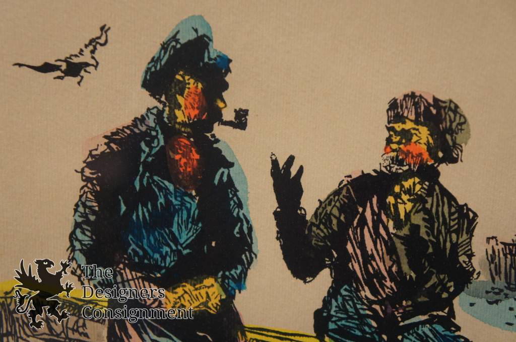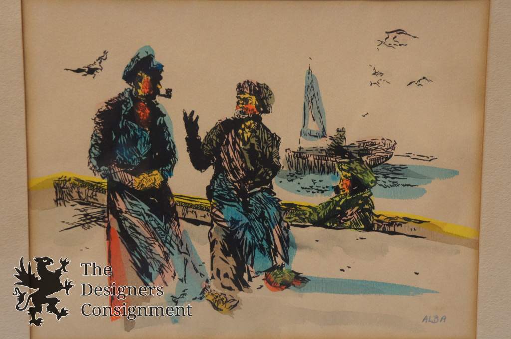 A lovely painting by Alba Zaiser. Features of portrait of 2 fisherman talking on the dock. A sailboat and seagulls can be seen in the background.