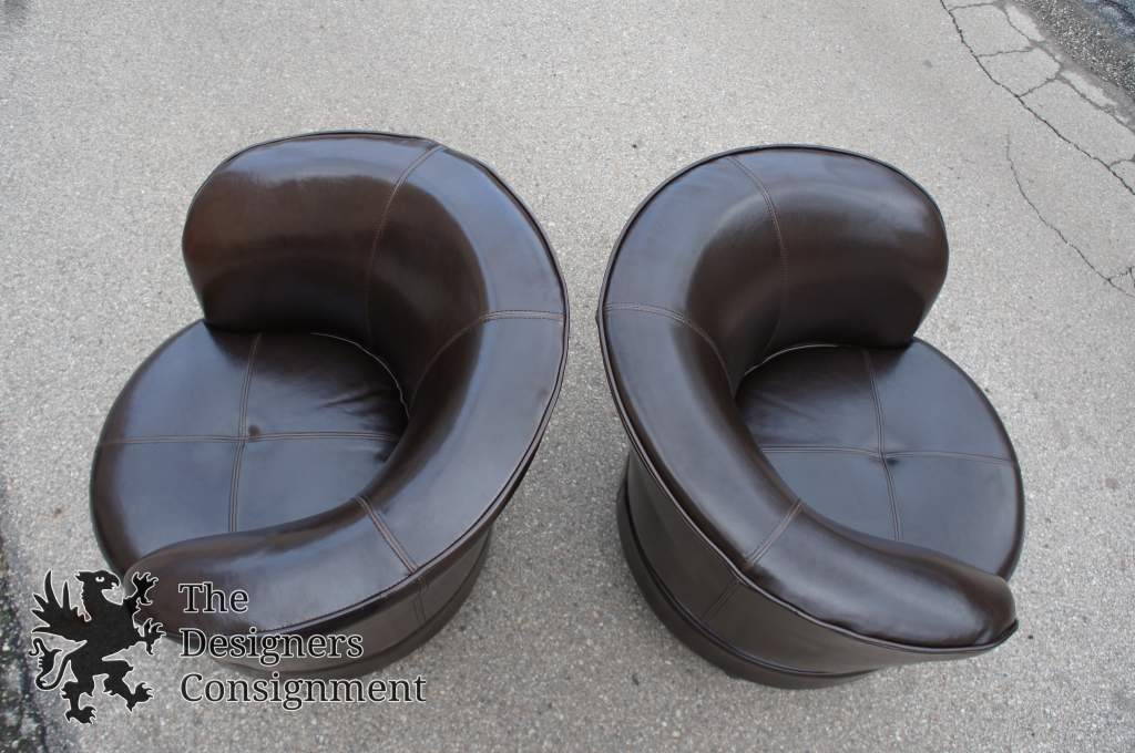 A great pair from frontgate. Upholstered in brown. Features a swivel base and black legs. Will be hand delivered via white glove service.