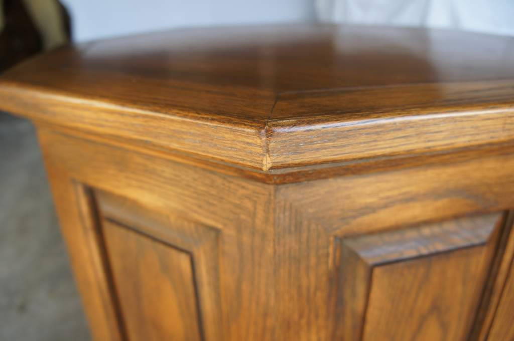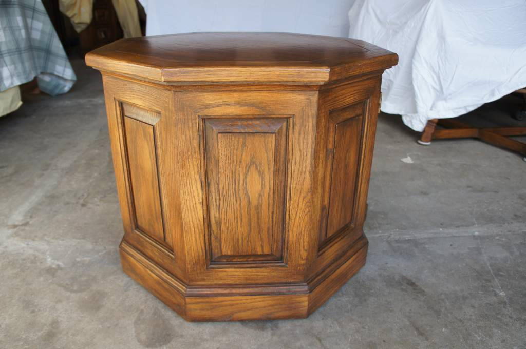 Octagonal drum table by Romweber. Made from oak with a hammered brass hardware and shelf