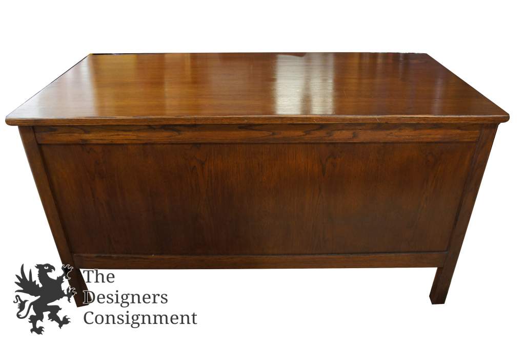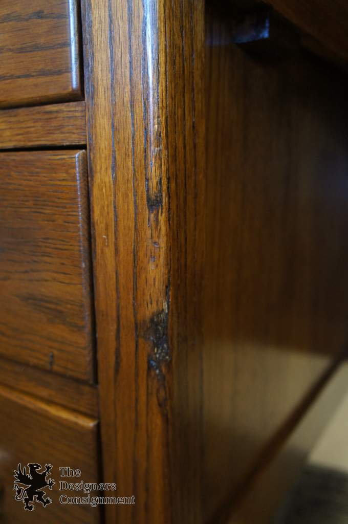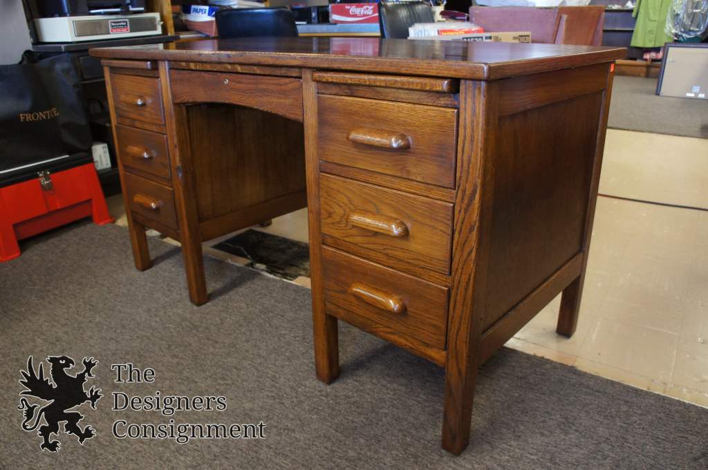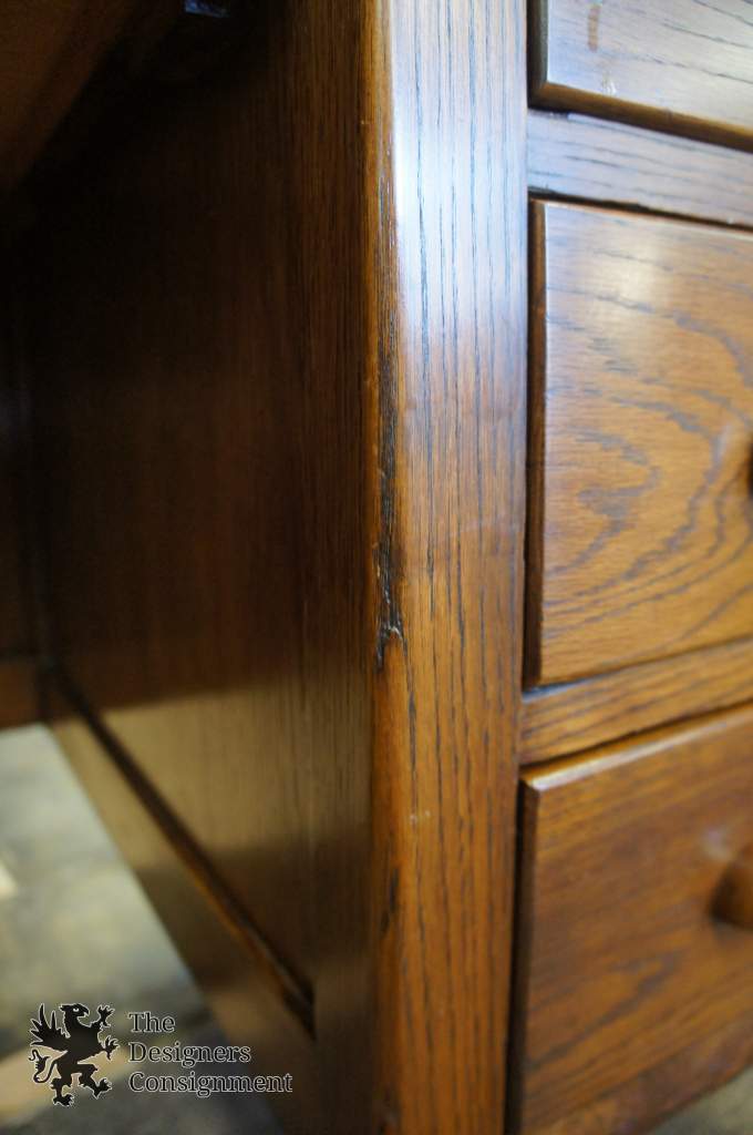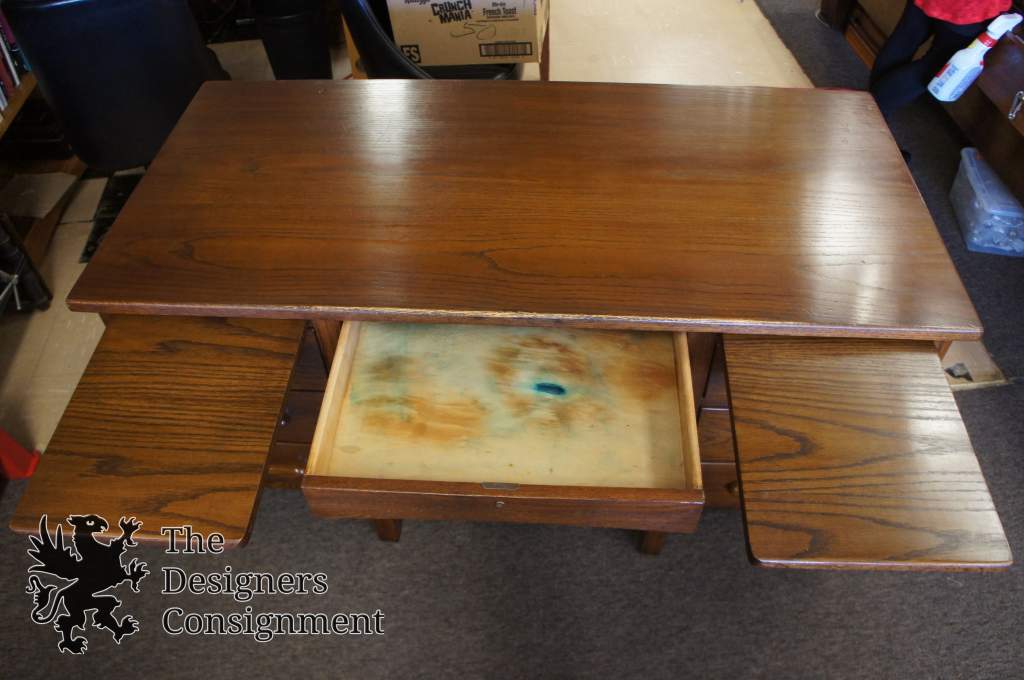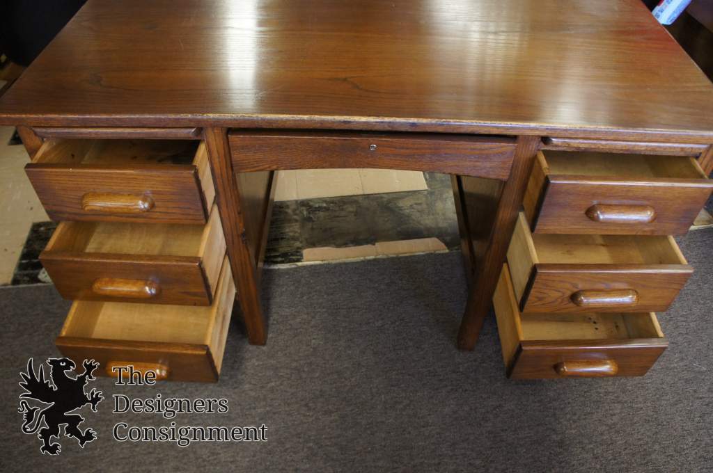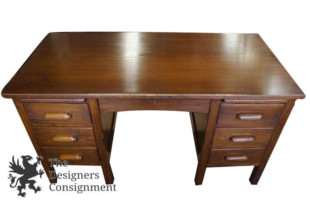 A beautiful early-mid 20th century oak desk. Features 7 drawers along the front in addition to 2 pull out writing pads. Will be hand delivered via white glove service.